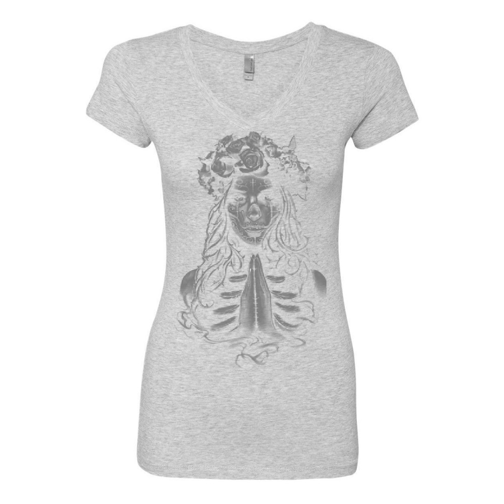 PRAY GIRL women's v-neck t-shirt calavera day of the dead dia de los muertos gray