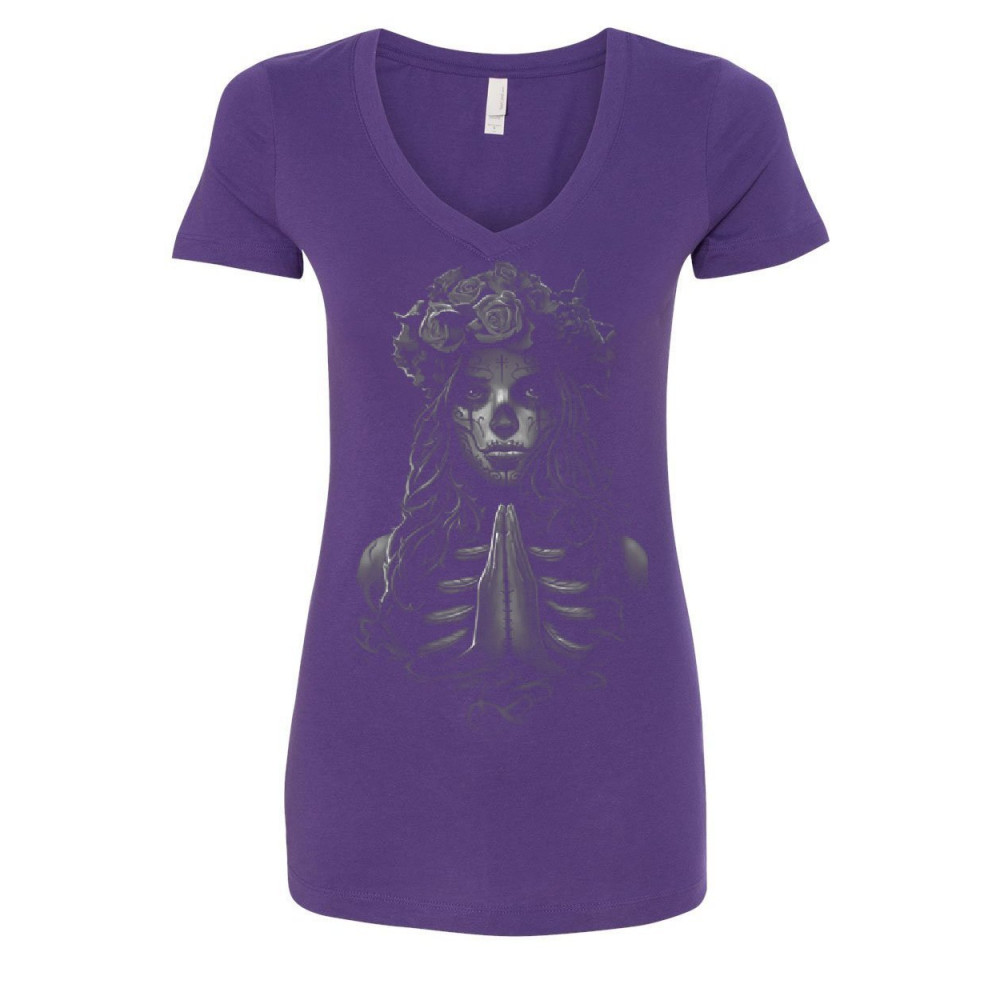 PRAY GIRL women's v-neck t-shirt calavera day of the dead dia de los muertos purple