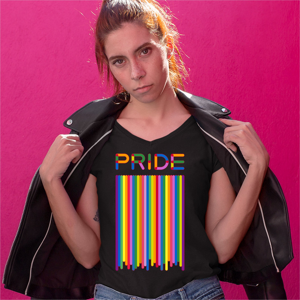 A print featuring a vertical flag painted in the colors of rainbow above which it says "Pride". Great choice to wear as a proud queer person.