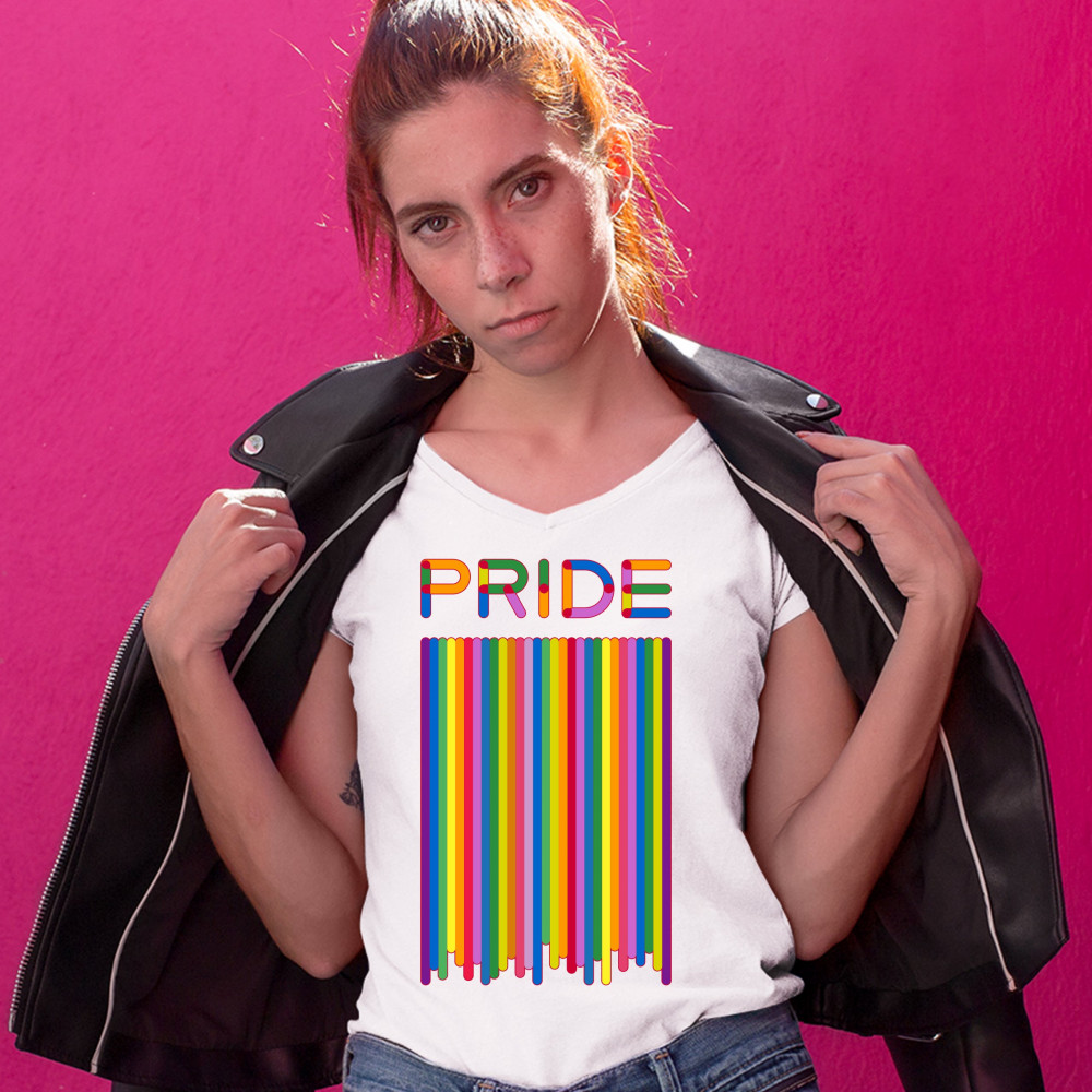 A print featuring a vertical flag painted in the colors of rainbow above which it says "Pride". Great choice to wear as a proud queer person.