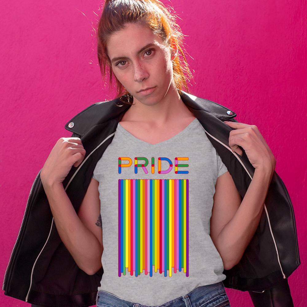 A print featuring a vertical flag painted in the colors of rainbow above which it says "Pride". Great choice to wear as a proud queer person.