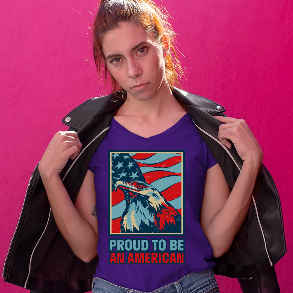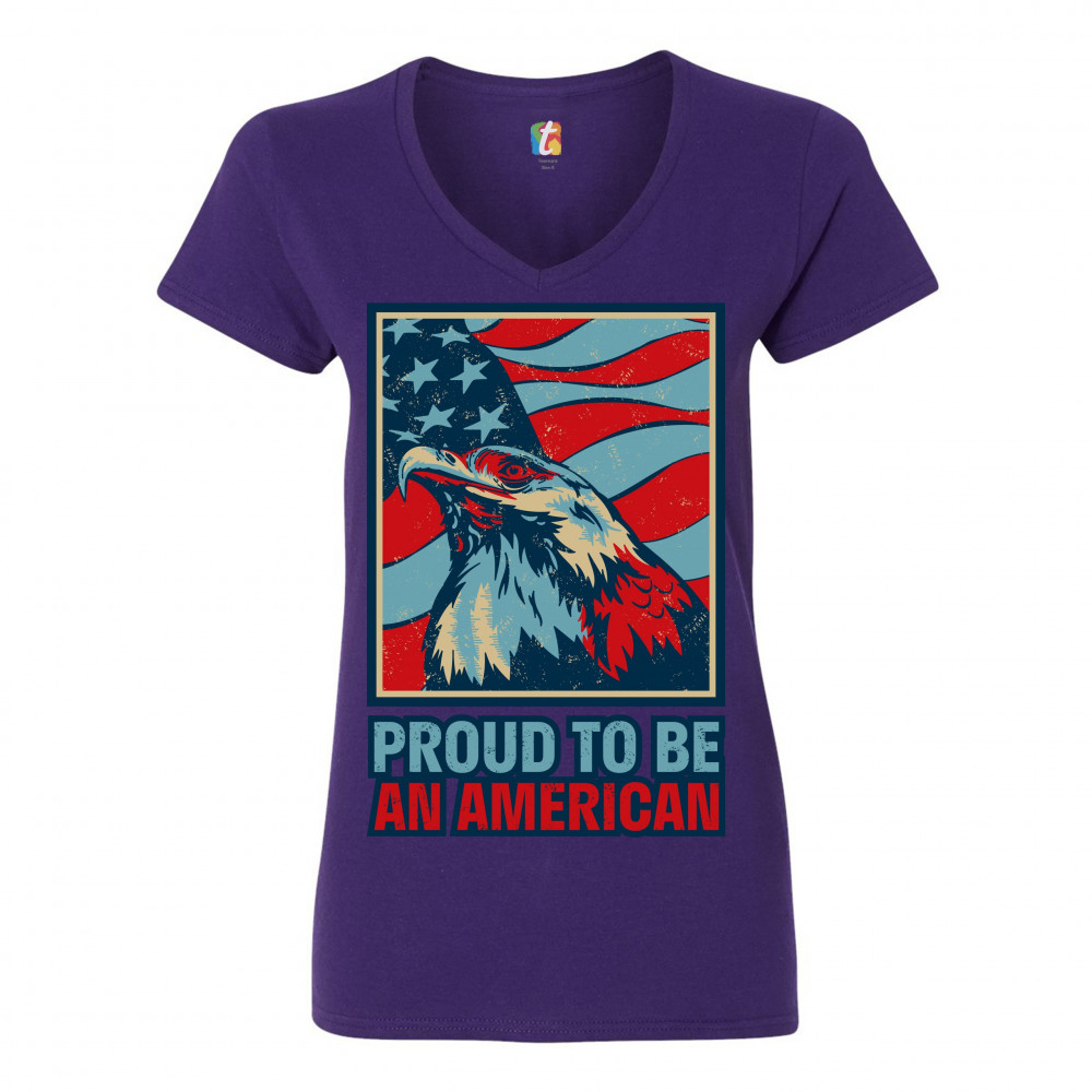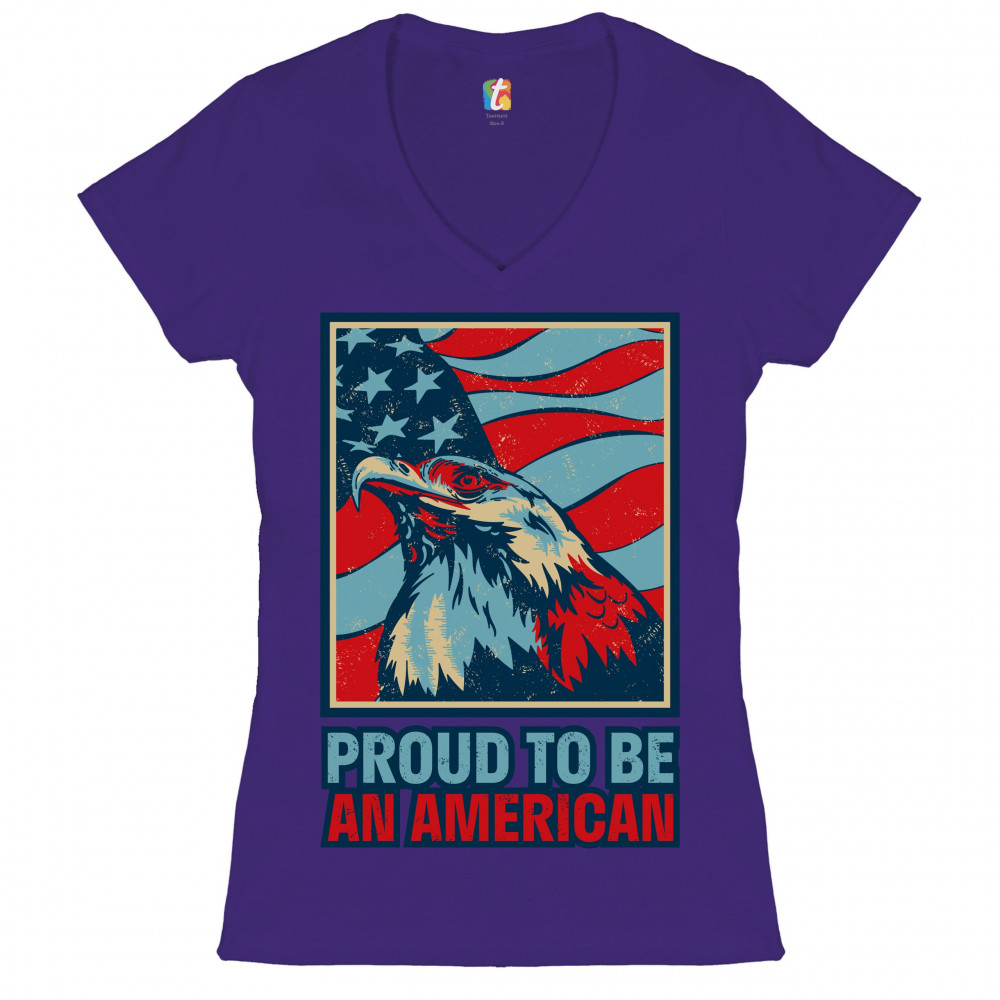 PROUD TO BE AN AMERICAN women's v-neck t-shirt 4th of july bald eagle usa tee purple