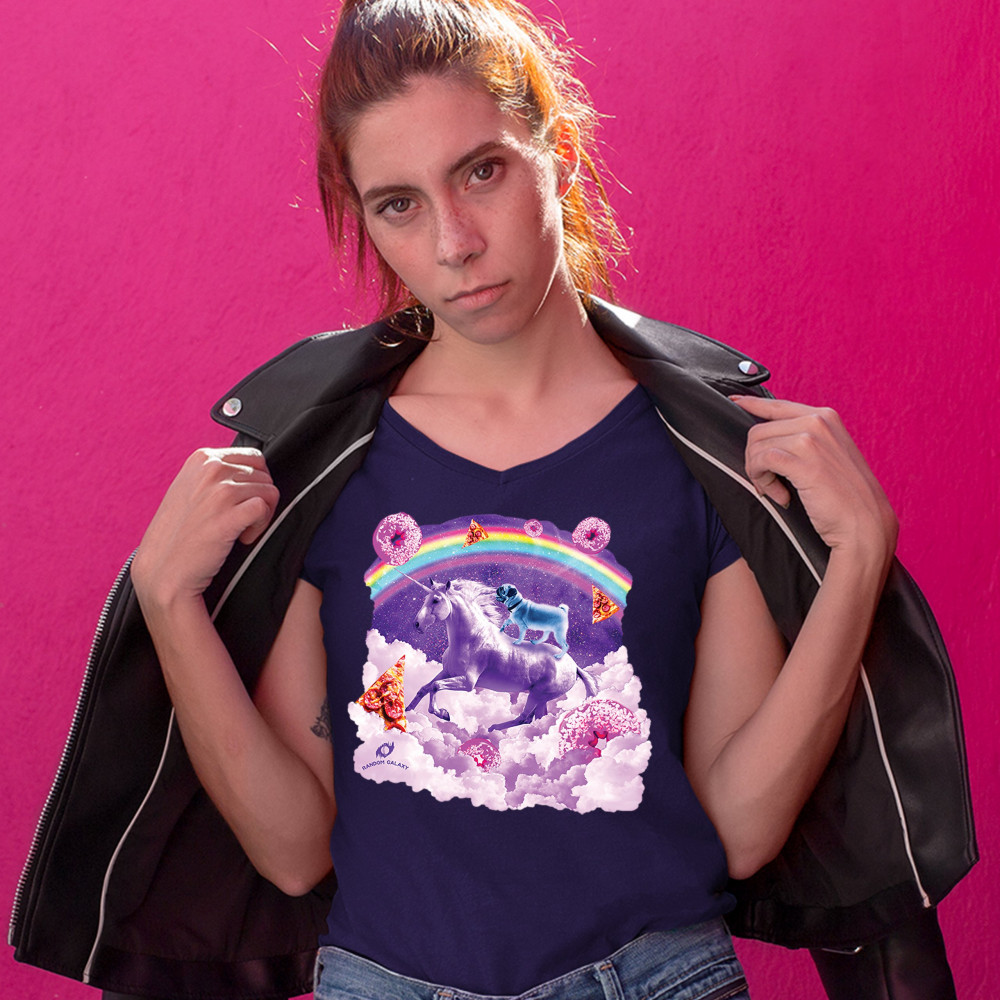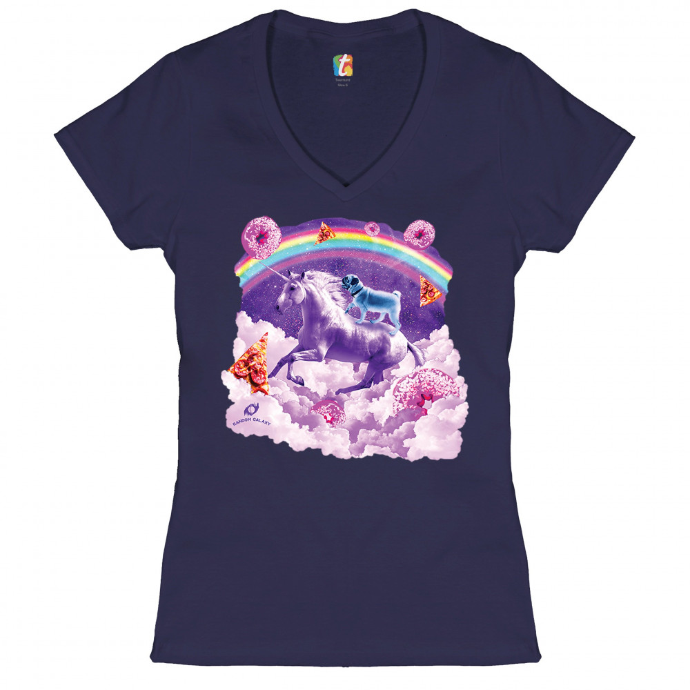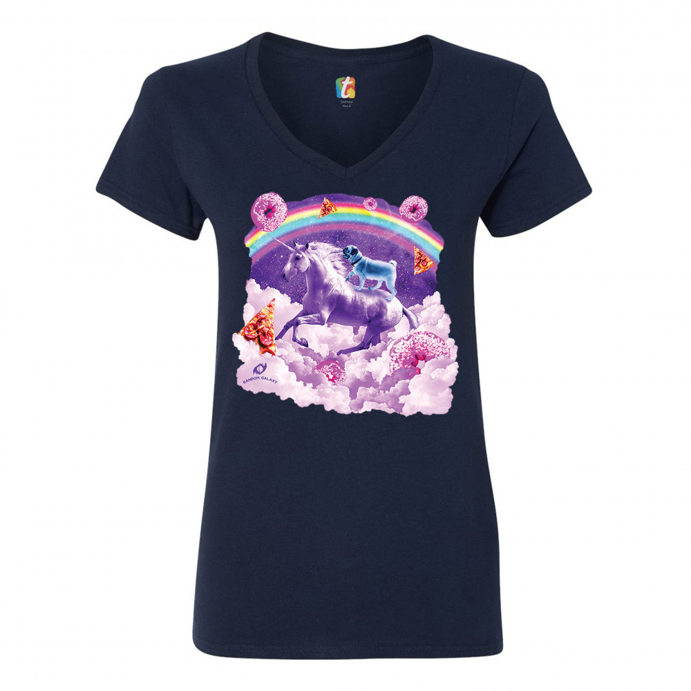 PUG RIDING A UNICORN IN CLOUDS women's v-neck t-shirt space rainbow donuts tee navy blue