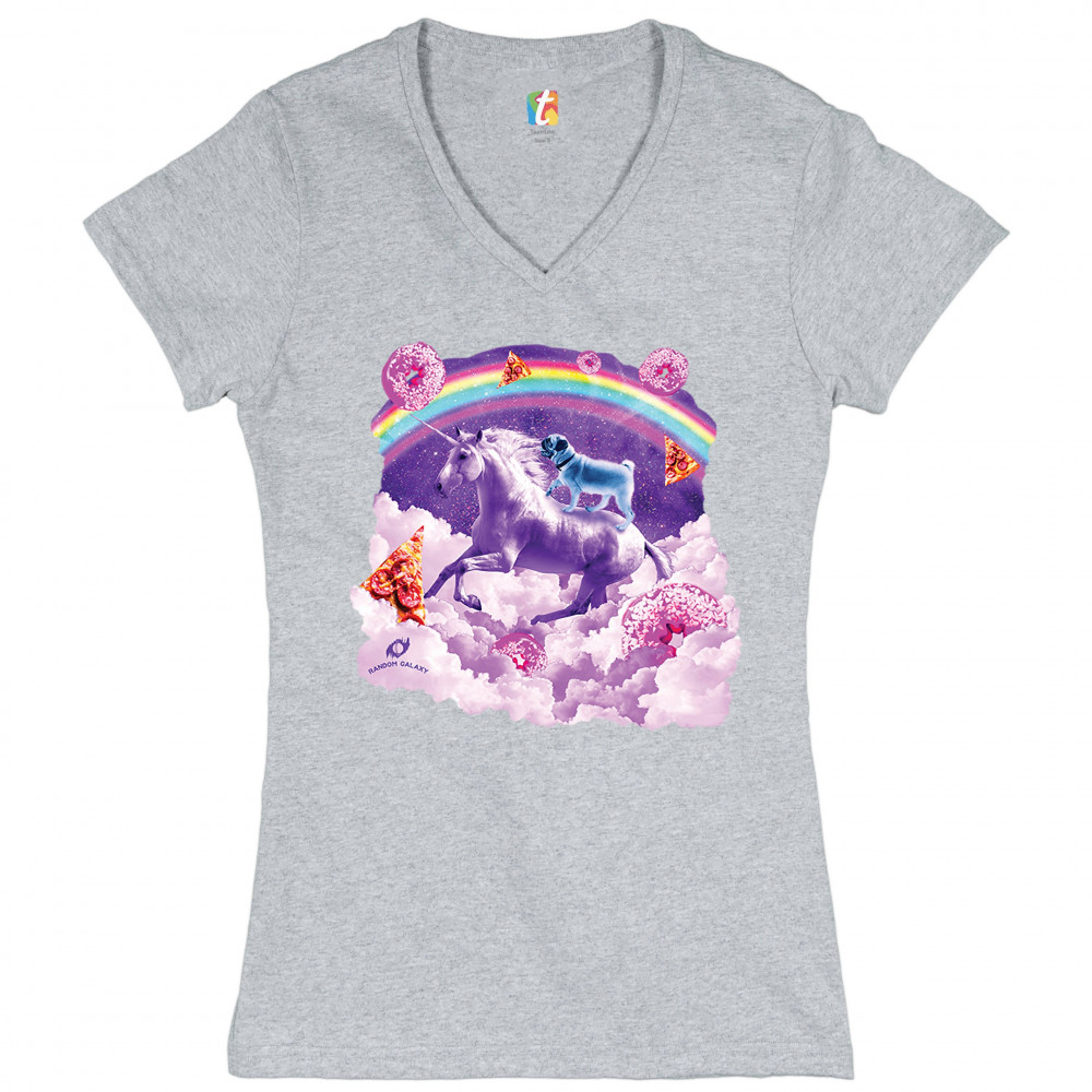A beautiful print featuring a pug standing on a back of a unicorn galloping through clouds. In the background a rainbow crossing the space is seen. Across the clouds numerous pizza slices and donuts are scattered. A great choice for a person who loves pug