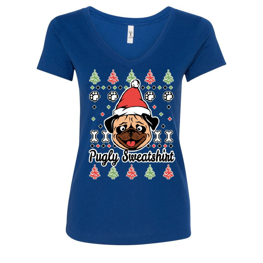 PUGLY SWEATSHIRT women's v-neck t-shirt pug ugly sweater jolly christmas xmas royal blue