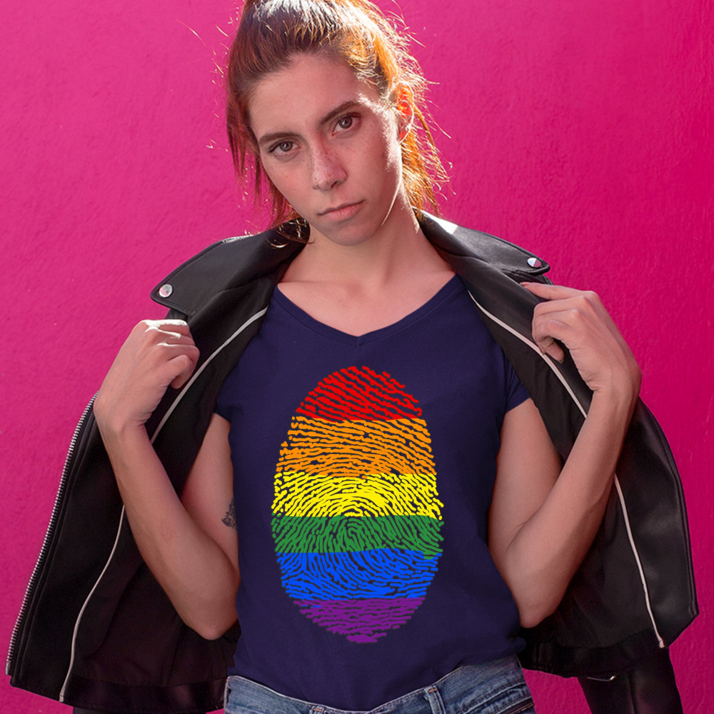 A print featuring a fingerprint painted in rainbow colors. Great choice to wear as a proud queer person.