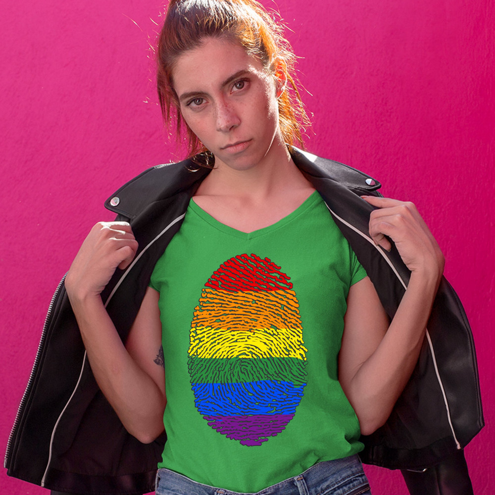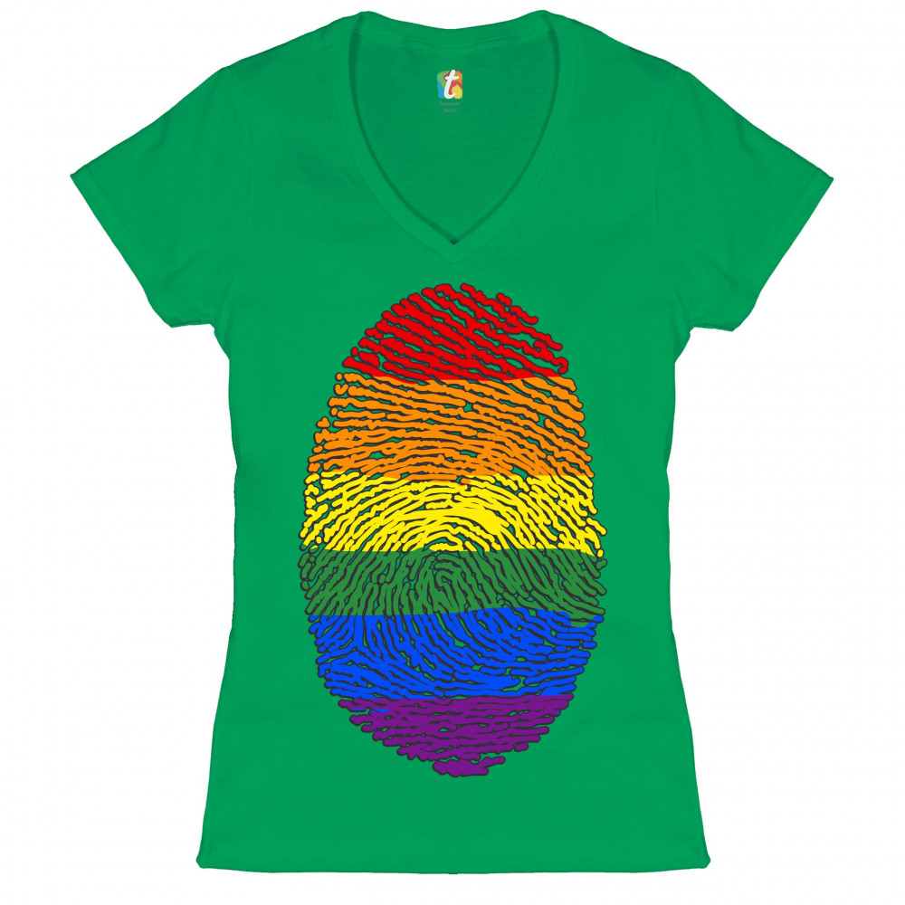 RAINBOW FINGERPRINT women's v-neck t-shirt gay pride month lgbtq support tee green
