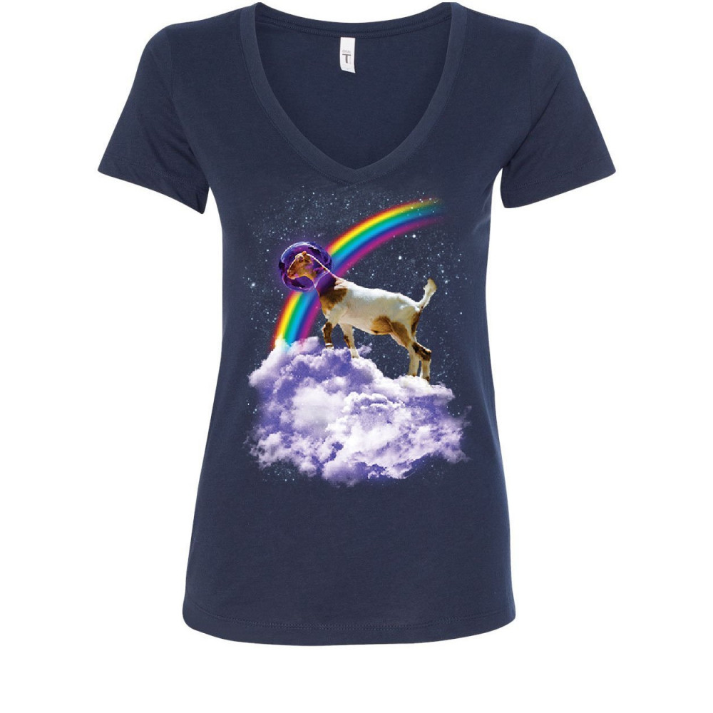 RAINBOW GOAT ON A CLOUD women's v-neck t-shirt galaxy space funny universe gag navy blue