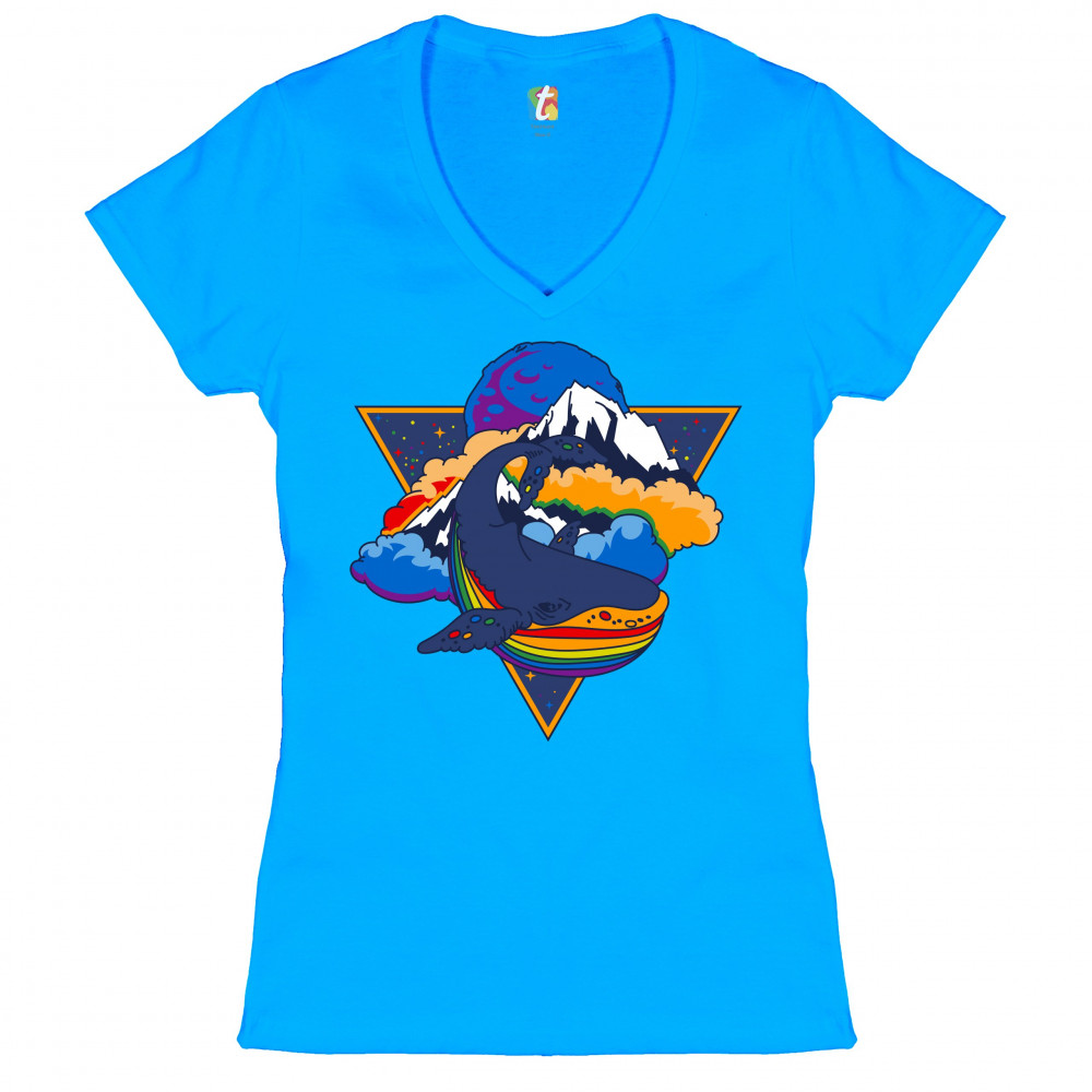 RAINBOW SPACE WHALE women's v-neck t-shirt lgbt pride tolerance trippy tee turquoise