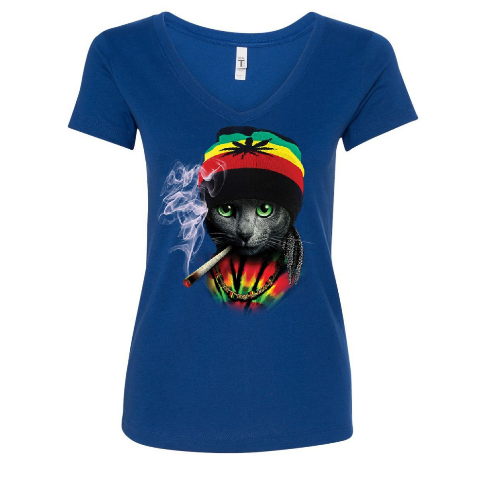 RASTA CAT women's v-neck t-shirt smoking joint 420 jamaica marijuana pot weed royal blue