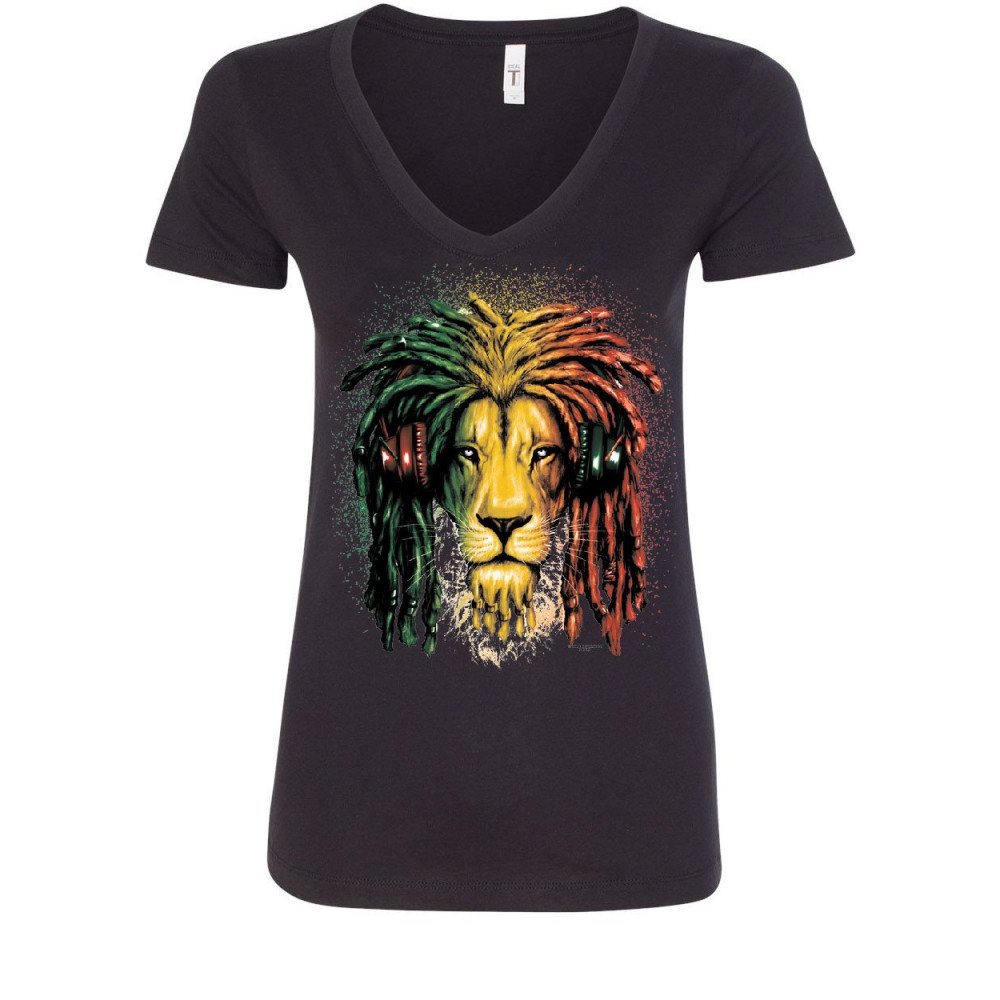 RASTA LION WITH HEADPHONES 420 rasta lion with headphones v-neck t-shirt reggae smoking jamaica 420 black