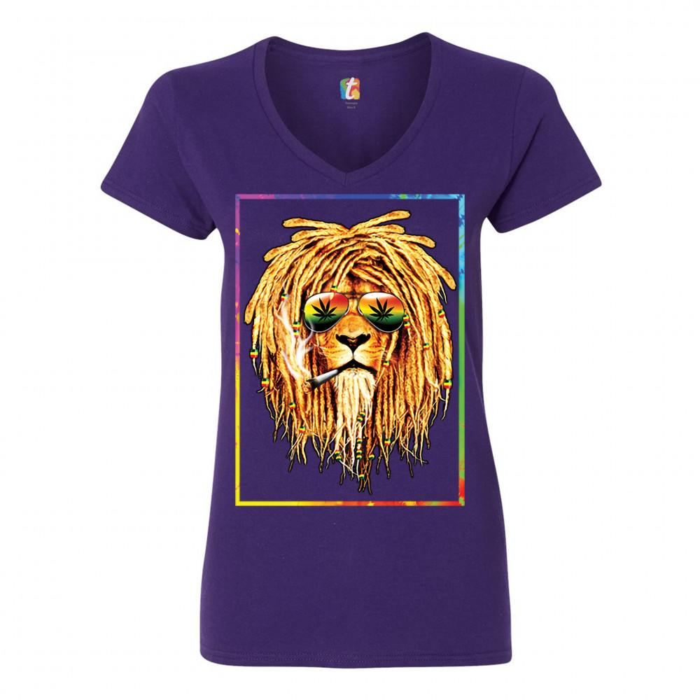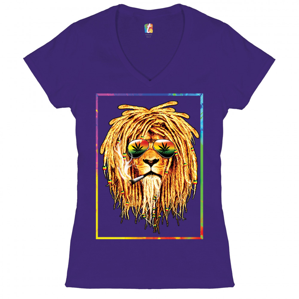 A print featuring a lion with dreadlocks smoking a joint and wearing sunglasses with marijuana leaves reflected in the them. The beads on the lion's dreadlocks and the glasses are painted with traditional Jamaican colors. Great choice for a pot aficionado