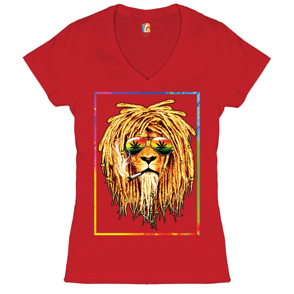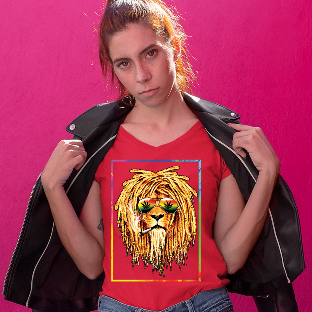 A print featuring a lion with dreadlocks smoking a joint and wearing sunglasses with marijuana leaves reflected in the them. The beads on the lion's dreadlocks and the glasses are painted with traditional Jamaican colors. Great choice for a pot aficionado