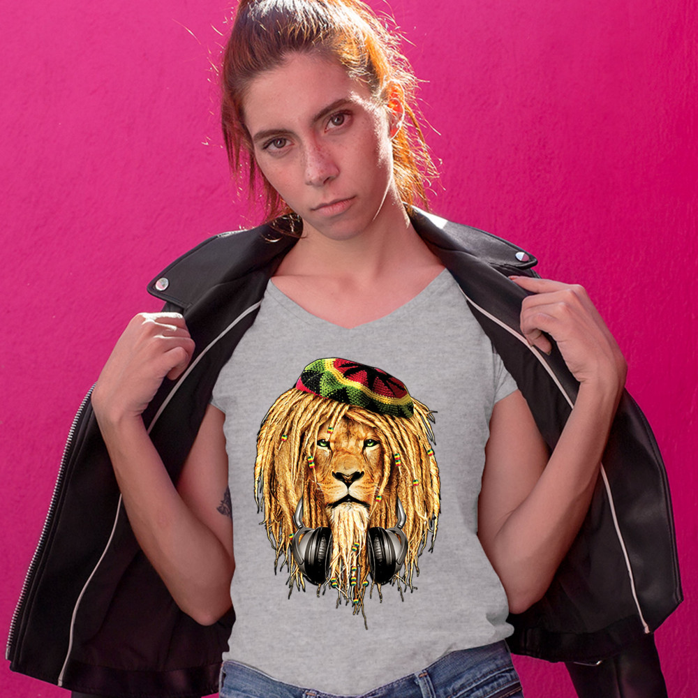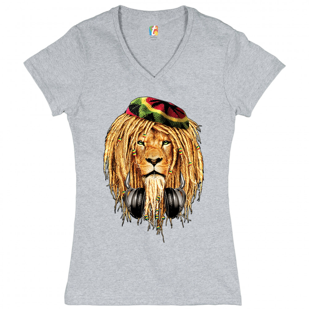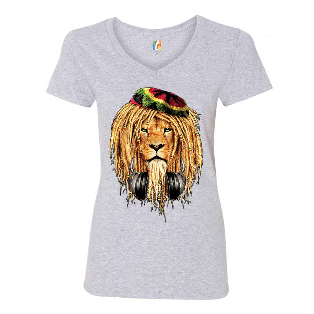 RASTA LION WITH HEADPHONES women's v-neck t-shirt jah jamaica reggae 420 tee gray