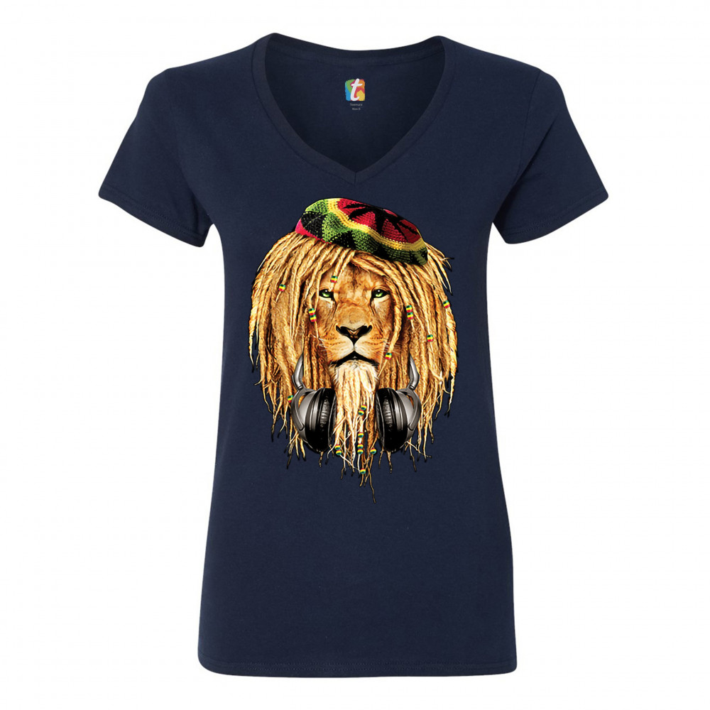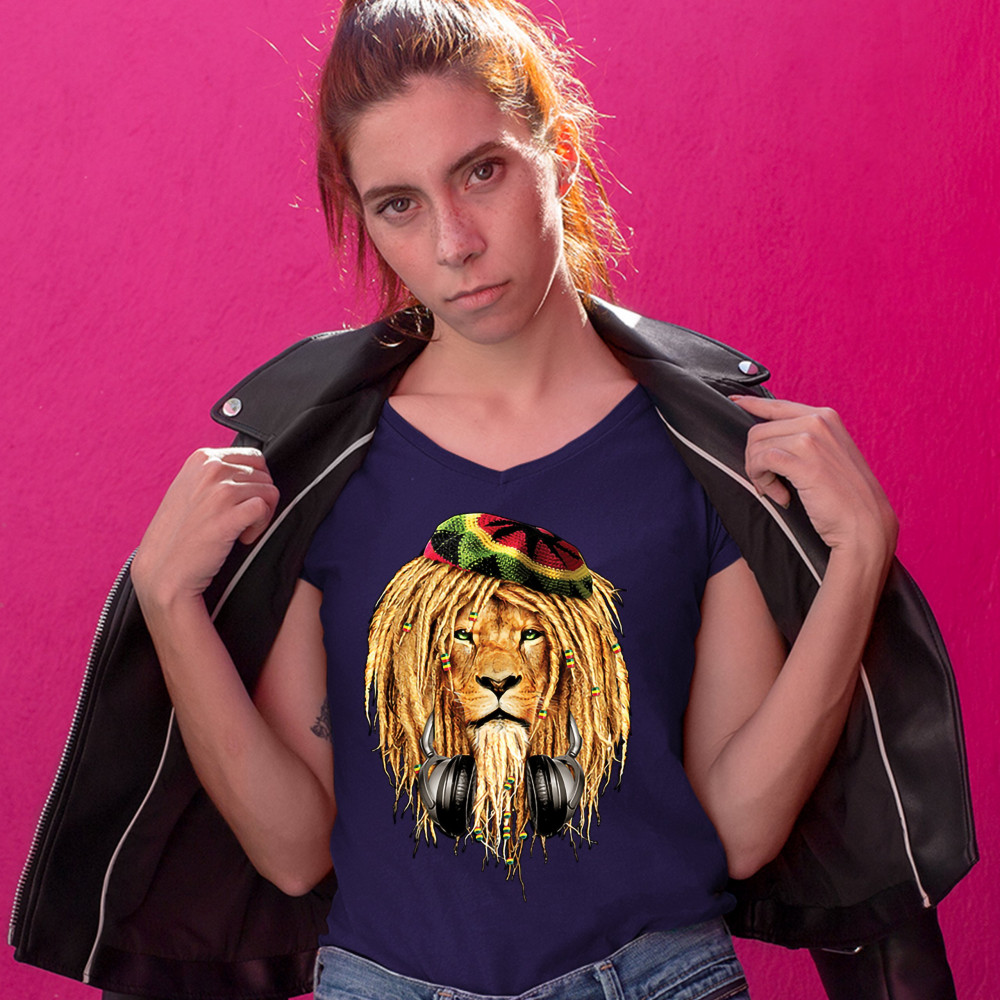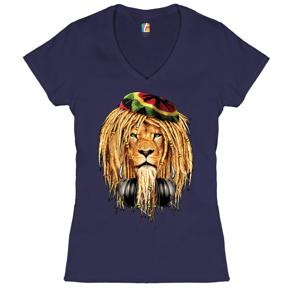 RASTA LION WITH HEADPHONES women's v-neck t-shirt jah jamaica reggae 420 tee navy blue