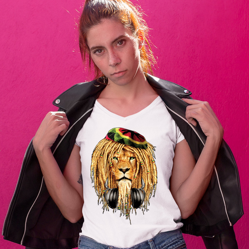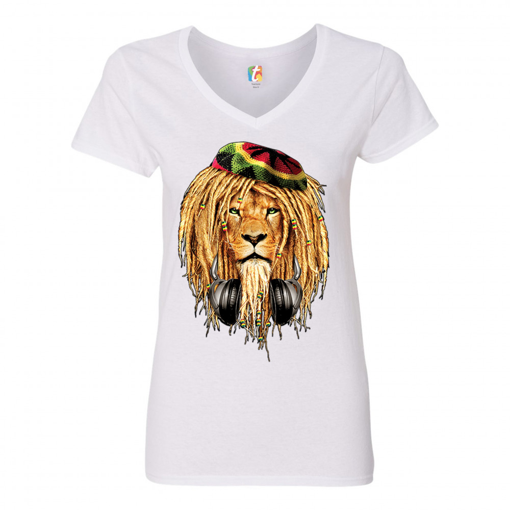 RASTA LION WITH HEADPHONES women's v-neck t-shirt jah jamaica reggae 420 tee white