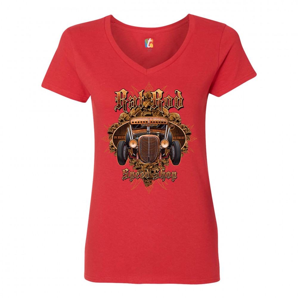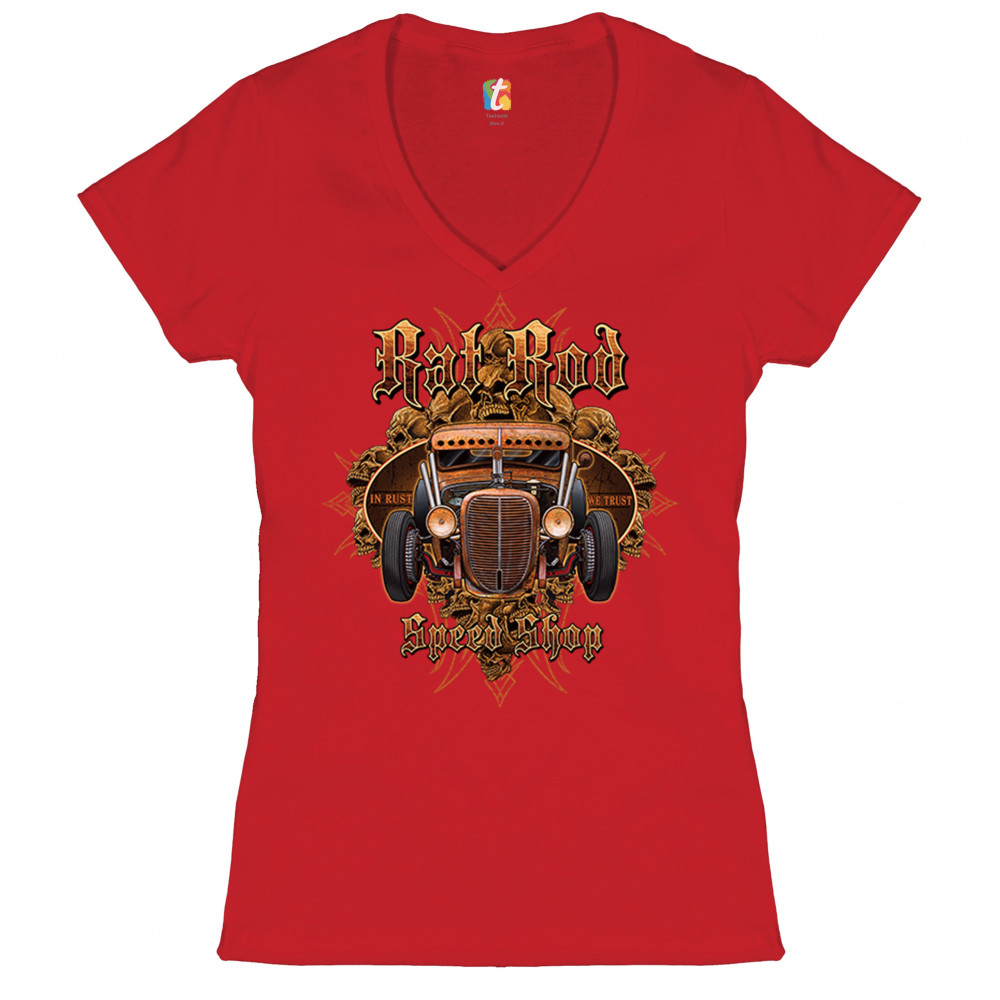 RAT ROD IN RUST WE TRUST women's v-neck t-shirt hot rod route 66 vintage tee red