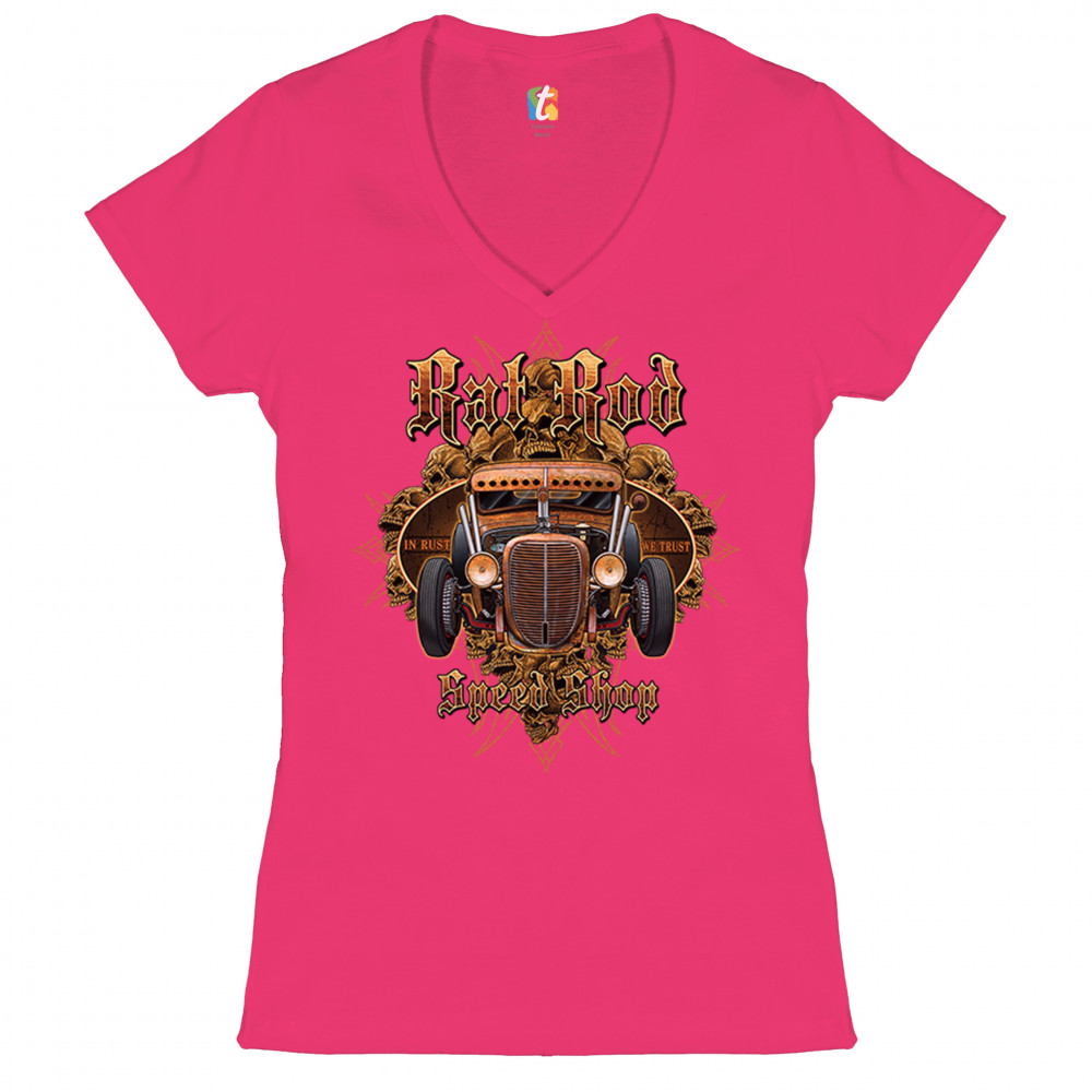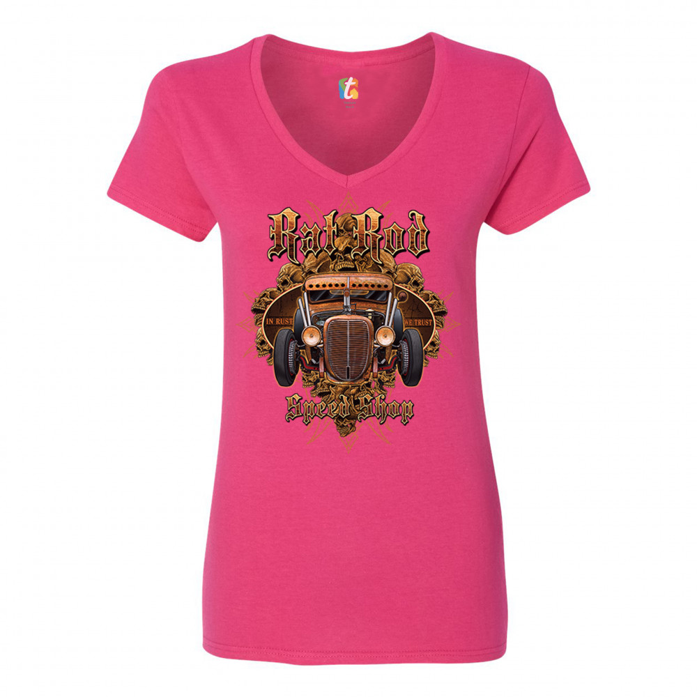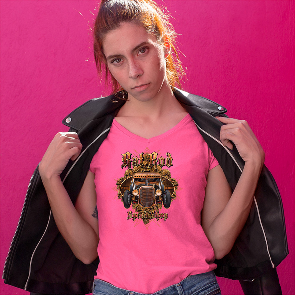 RAT ROD IN RUST WE TRUST women's v-neck t-shirt hot rod route 66 vintage tee pink