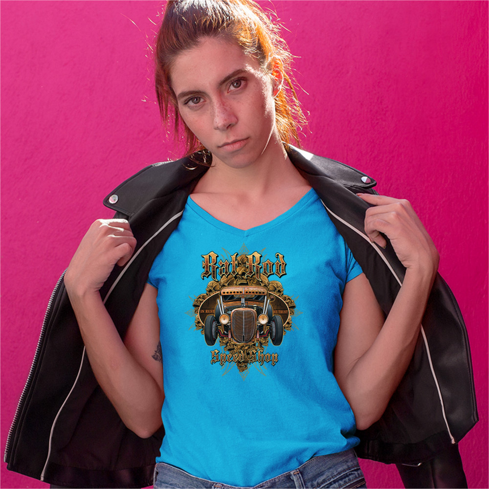 RAT ROD IN RUST WE TRUST women's v-neck t-shirt hot rod route 66 vintage tee turquoise
