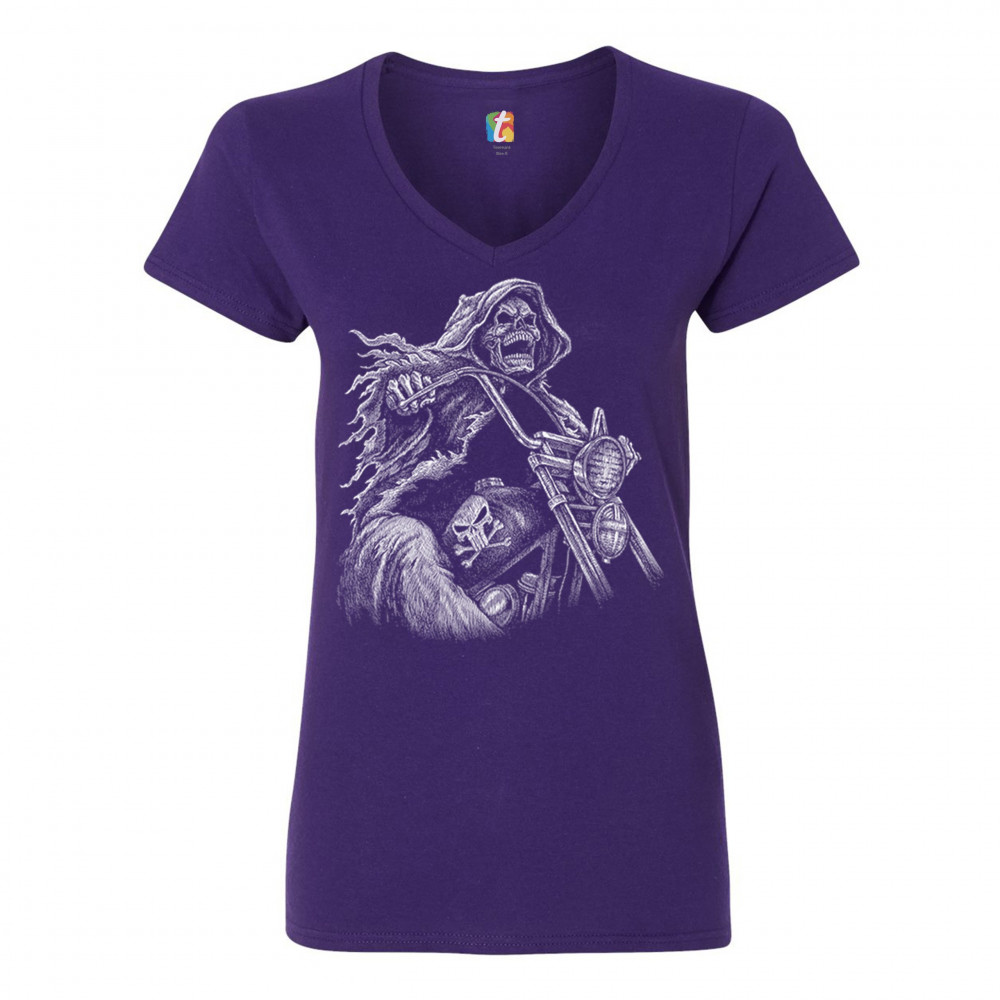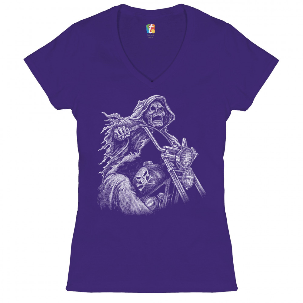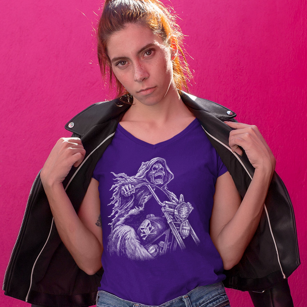 REAPER BIKER women's v-neck t-shirt ride or die skeleton biker forever tee purple