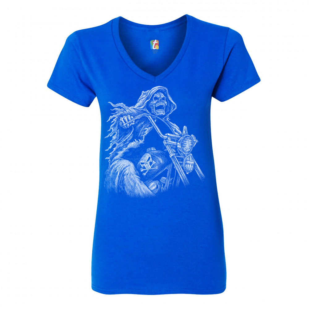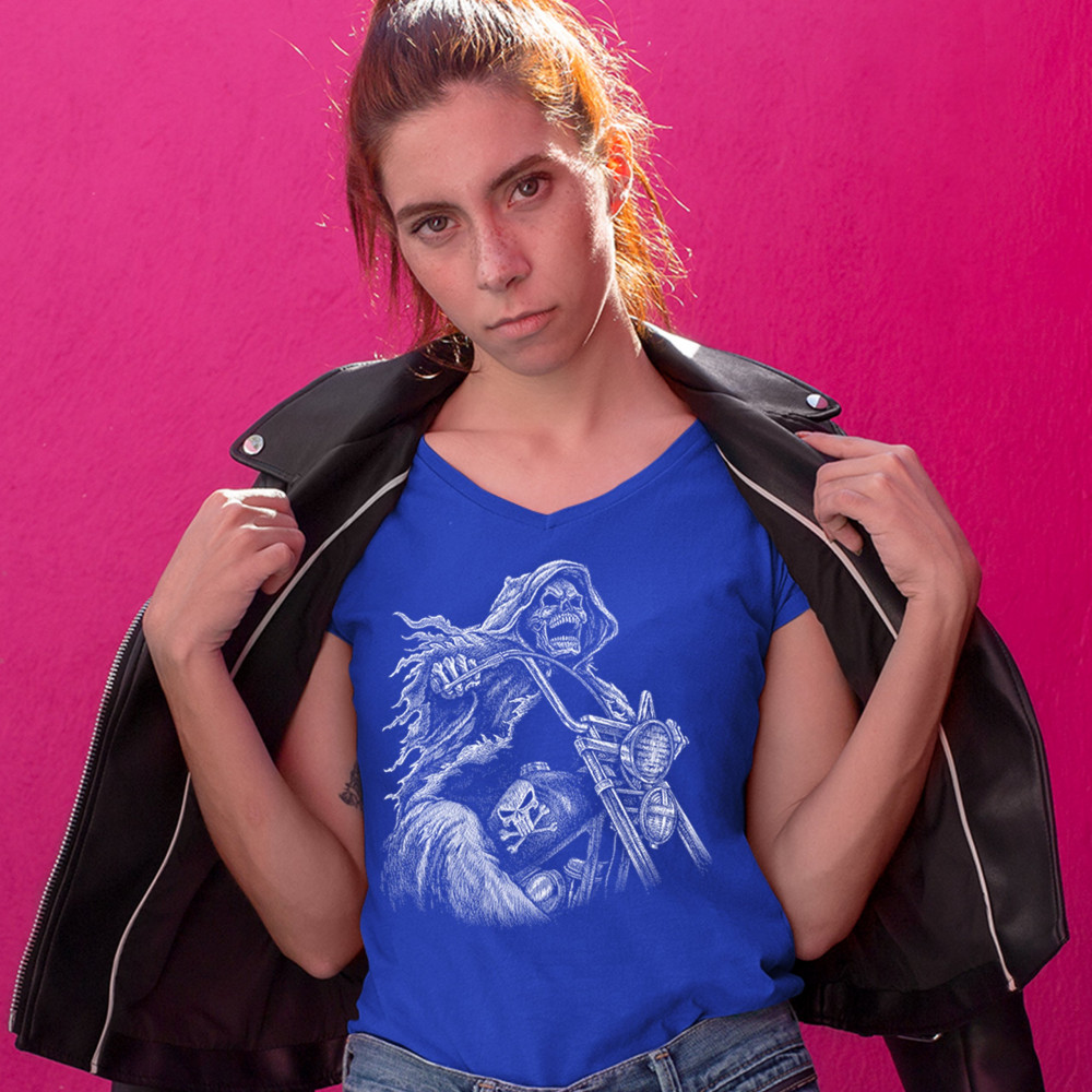 REAPER BIKER women's v-neck t-shirt ride or die skeleton biker forever tee royal blue
