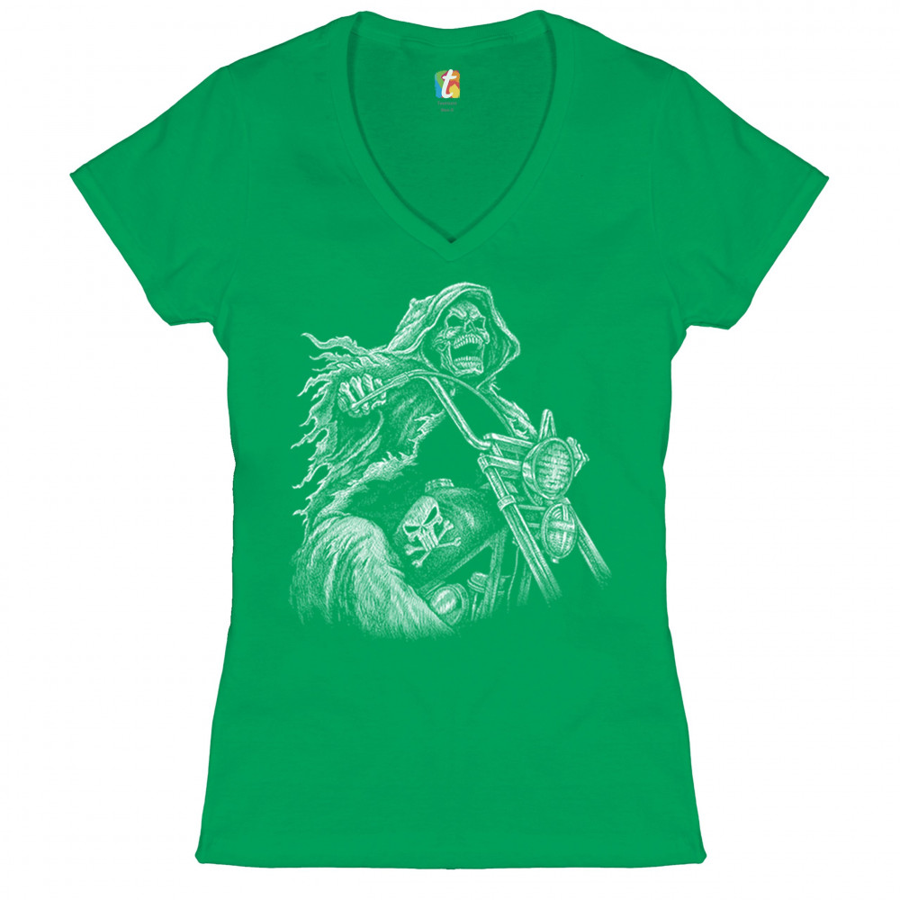 REAPER BIKER women's v-neck t-shirt ride or die skeleton biker forever tee green