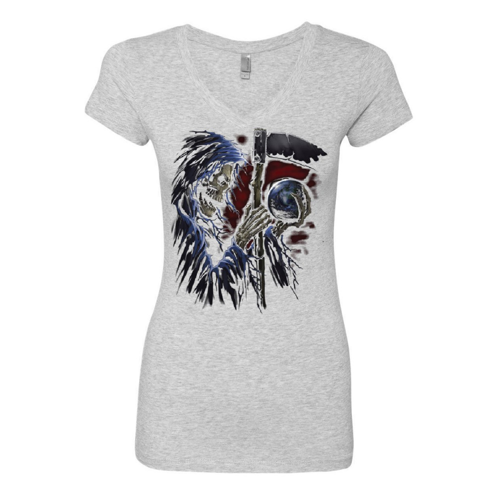 REAPER SPHERE SCYTHE women's v-neck t-shirt death skull creepy scary monster gray