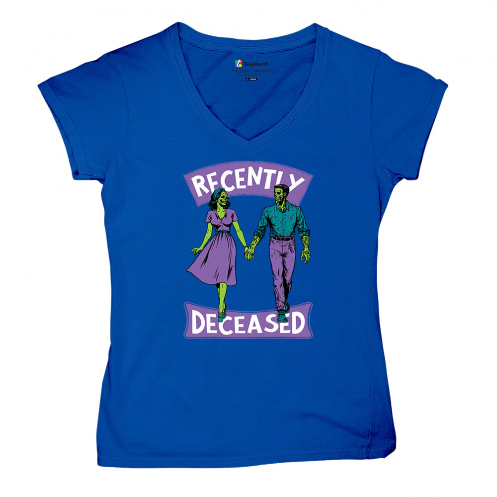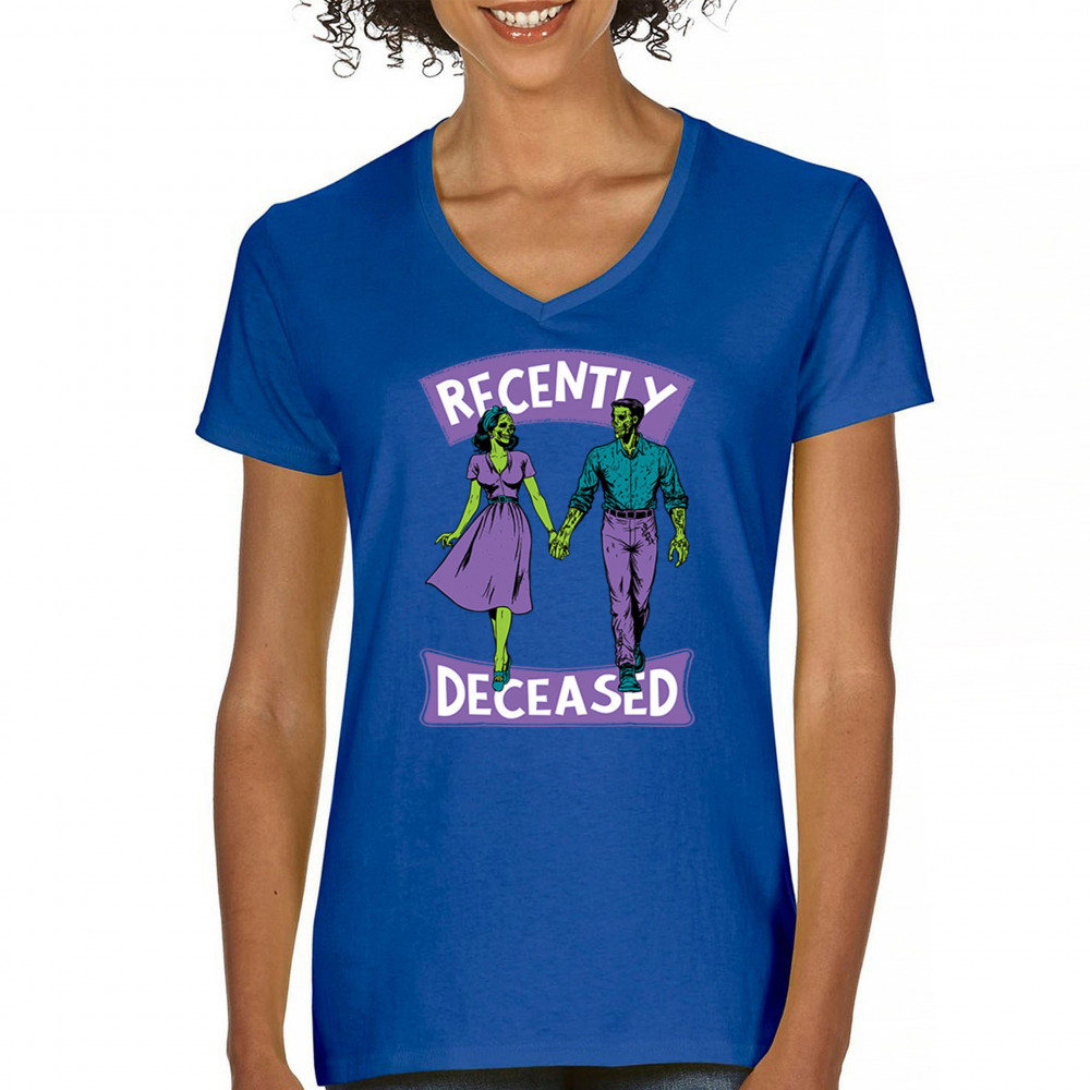 Recently Deceased zombie couple shirt with undead lovers design, spooky season humor, Halloween zombie outfit, and haunted house vibes.