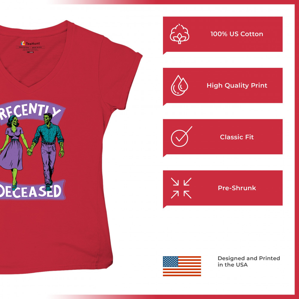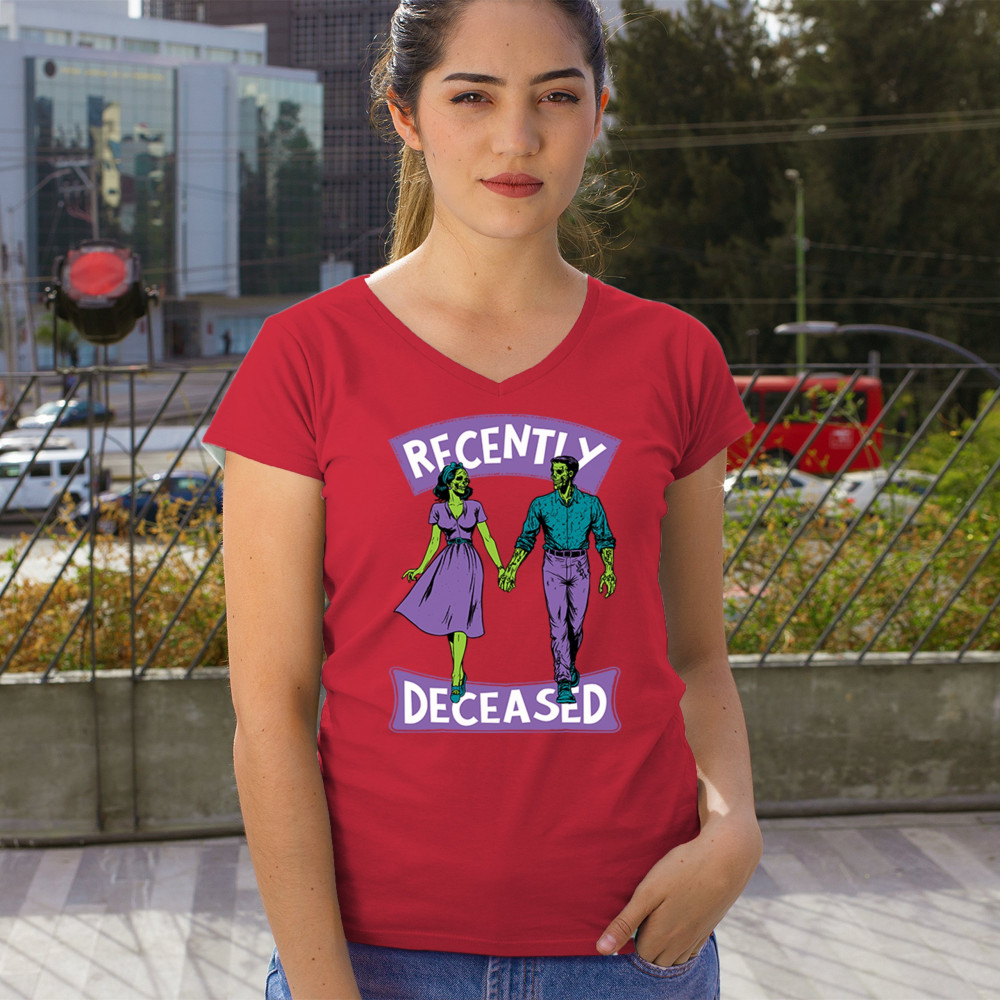 Recently Deceased zombie couple shirt with undead lovers design, spooky season humor, Halloween zombie outfit, and haunted house vibes.