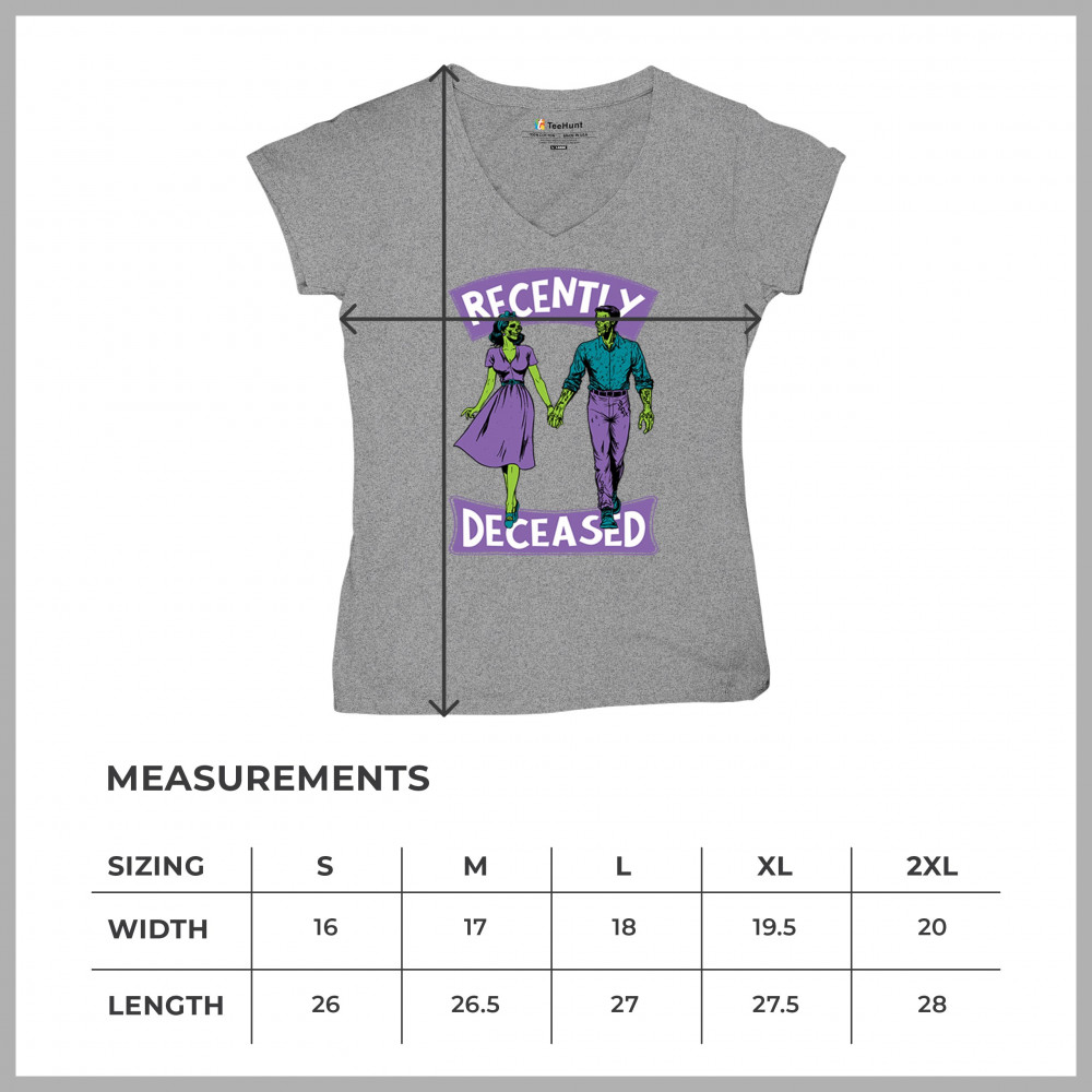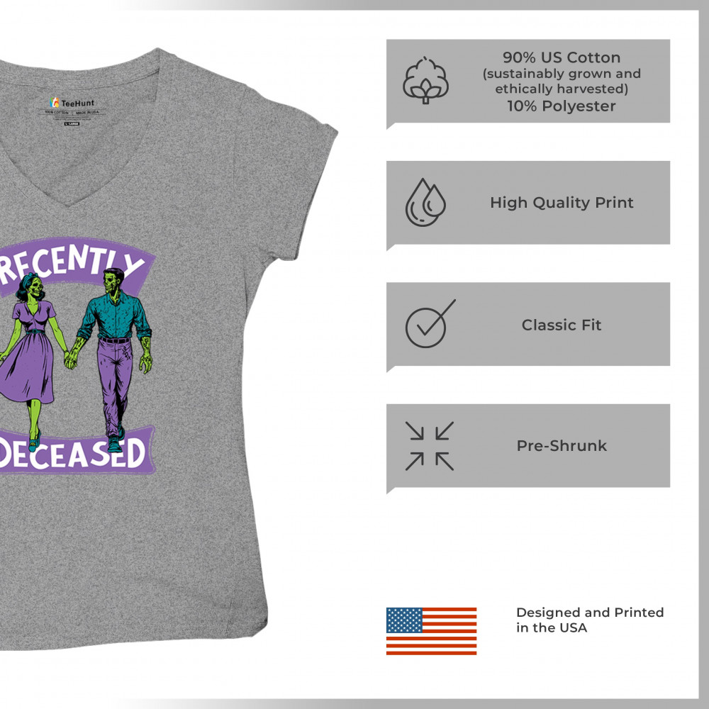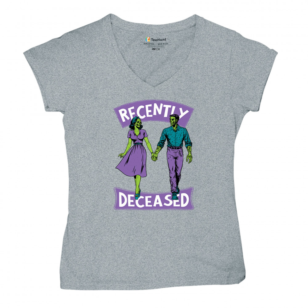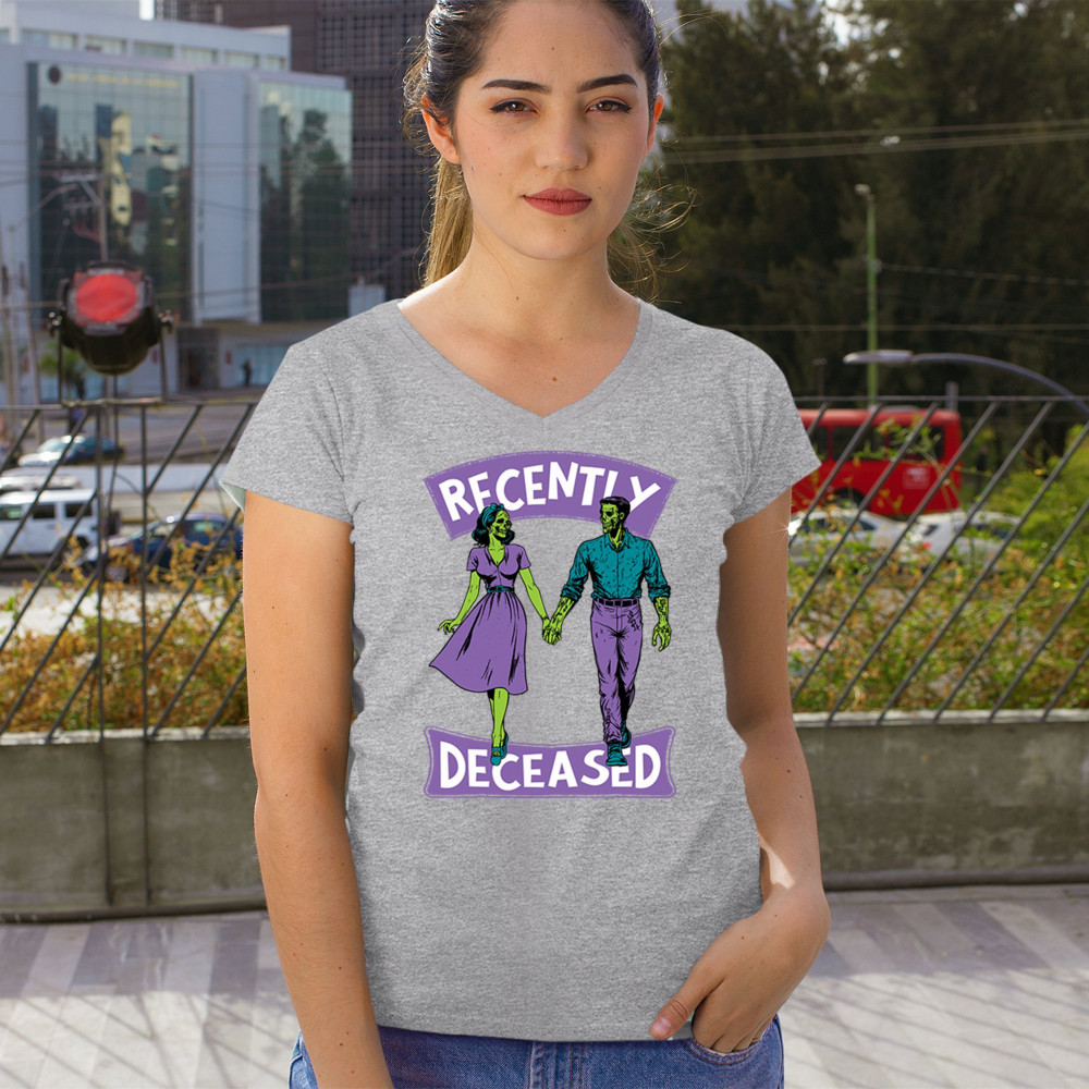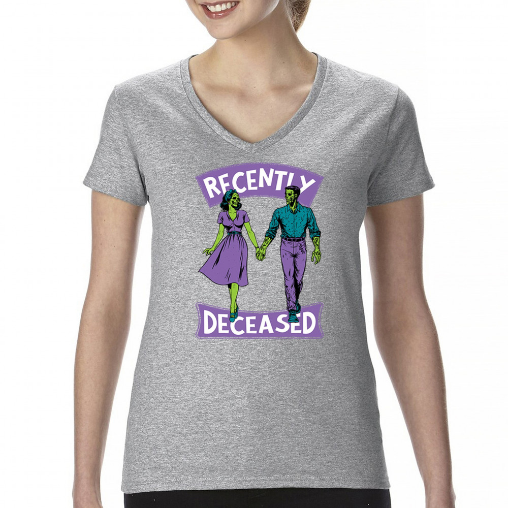 Recently Deceased zombie couple shirt with undead lovers design, spooky season humor, Halloween zombie outfit, and haunted house vibes.