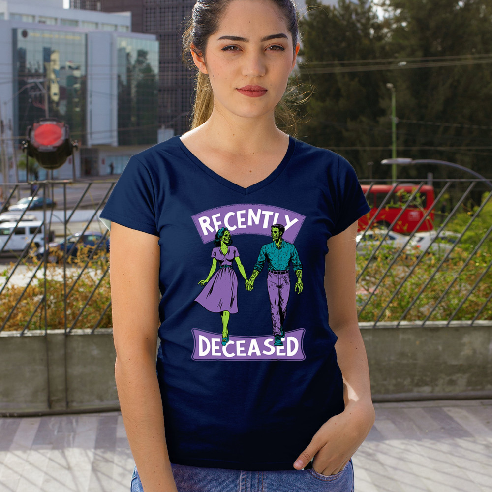 Recently Deceased zombie couple shirt with undead lovers design, spooky season humor, Halloween zombie outfit, and haunted house vibes.