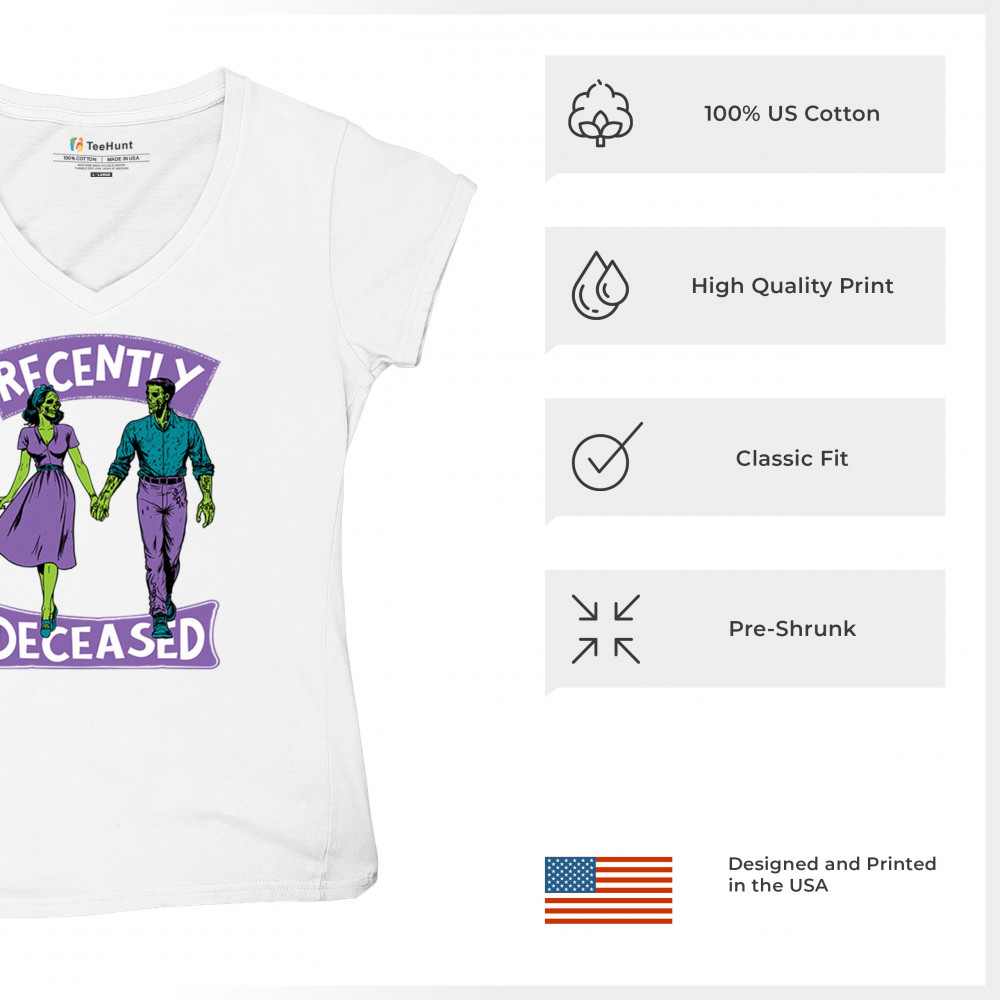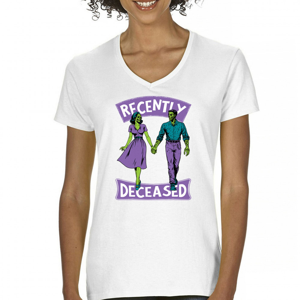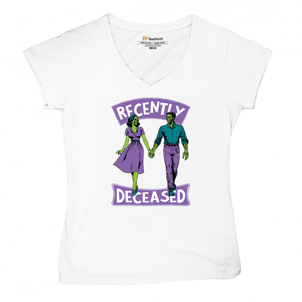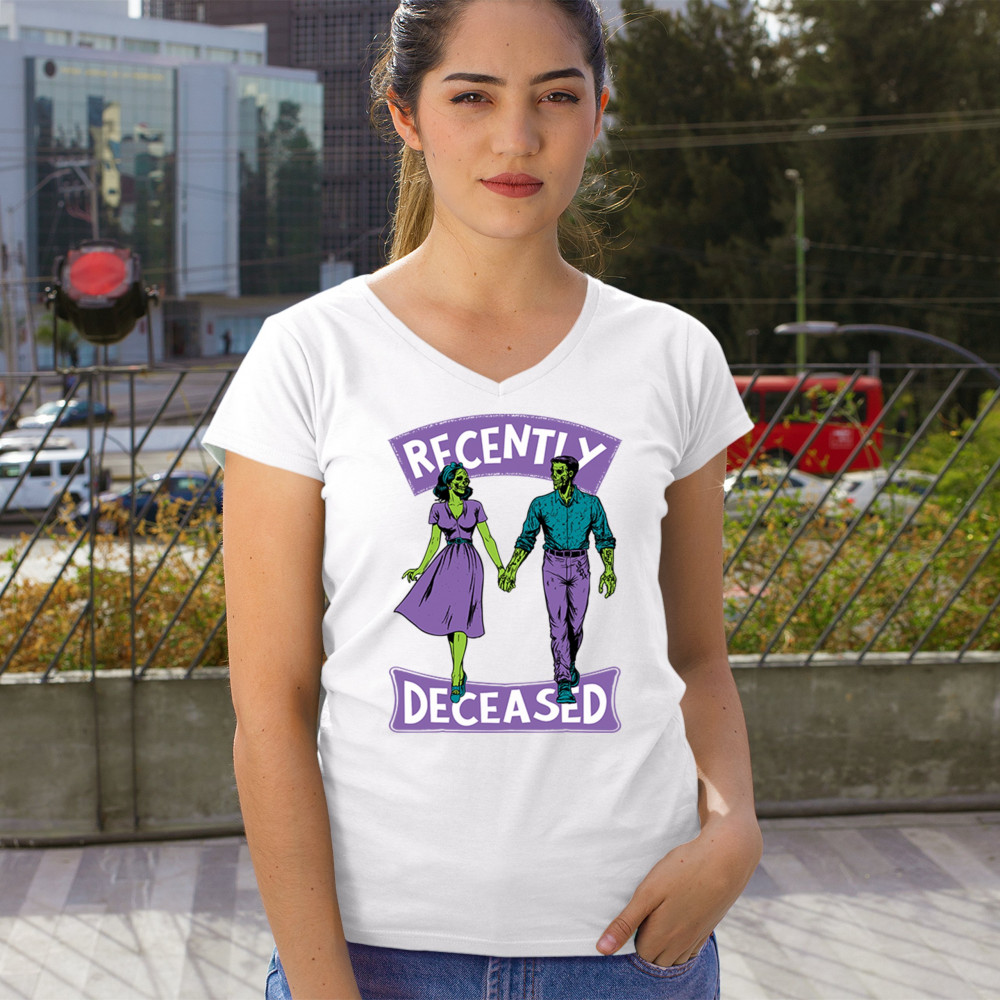 Recently Deceased zombie couple shirt with undead lovers design, spooky season humor, Halloween zombie outfit, and haunted house vibes.