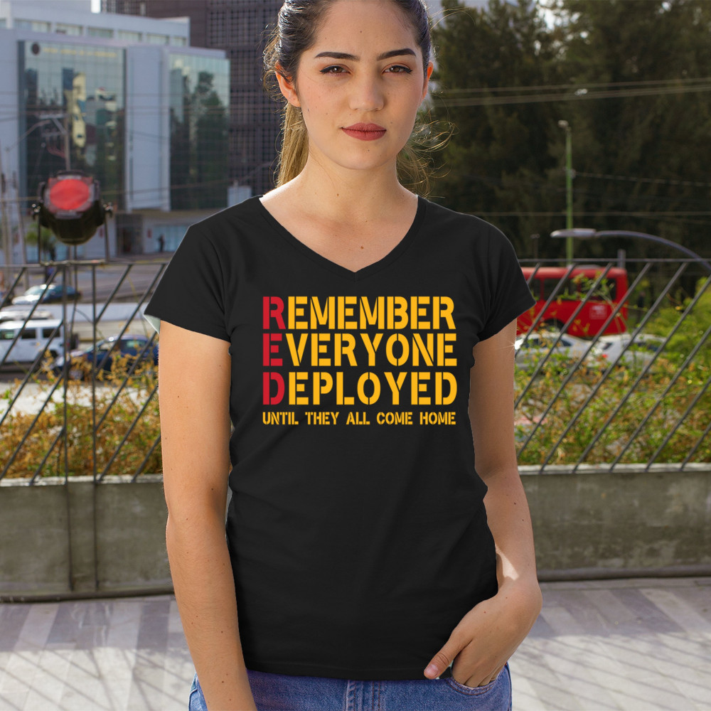 Show your support for our deployed troops with this "Remember Everyone Deployed" shirt. The bold and striking design is perfect for expressing your patriotic pride and honoring those who serve. Made from soft and durable materials, this shirt is ideal for everyday wear or special occasions like Veterans Day, Memorial Day, and the Fourth of July. Whether you're participating in a community event, attending a parade, or just want to show your appreciation, this shirt is a great choice. It also makes a thoughtful gift for anyone who supports our military heroes.