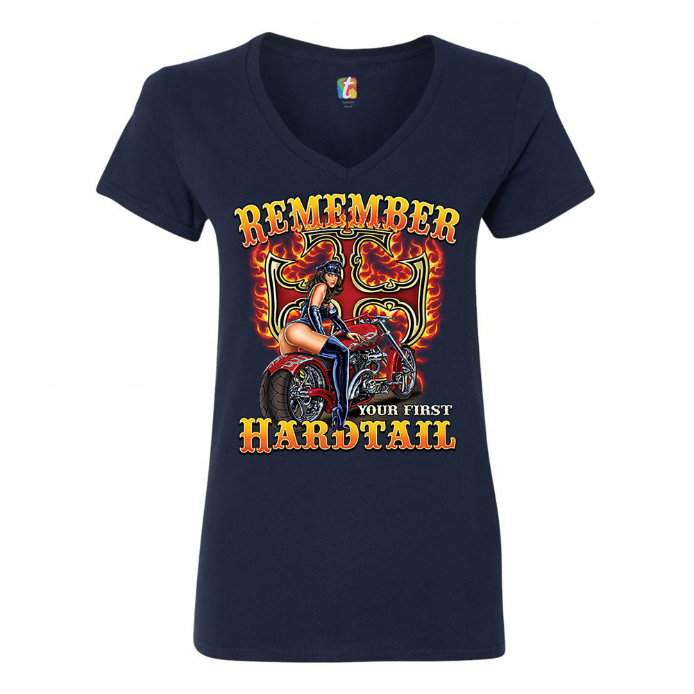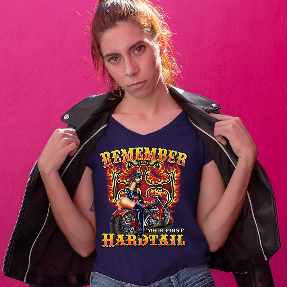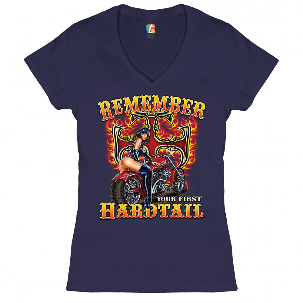 REMEMBER YOUR FIRST HARDTAIL women's v-neck t-shirt biker babe motorcycle tee navy blue