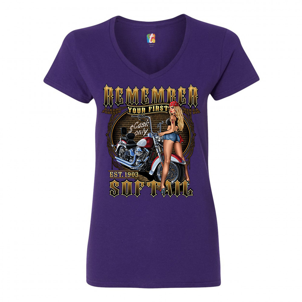 A print featuring a sexy pin-up girl in daisy dukes standing in front of a motorcycle. In the background there is a brick wall with "$ cash only" written on it. The print says: "Remember your first softail, biker forever, biker til i die, est. 1903". A gr