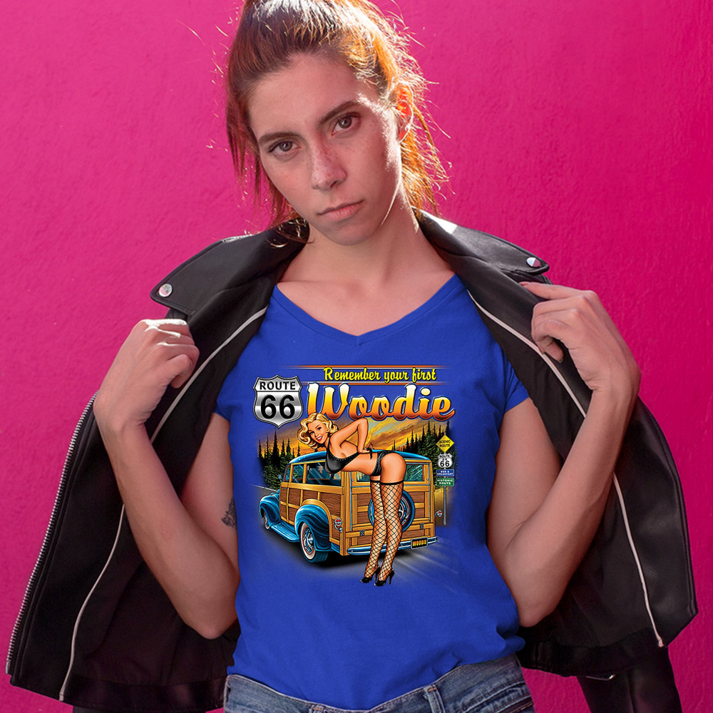 A print featuring a sexy blonde pin-up girl bending over and taking off her bra. Behind her there is a woodie wagon driving on a road. The print says: "Remeber your first woodie" and features a Route 66. A great choice for a fan of the legendary Mother Ro