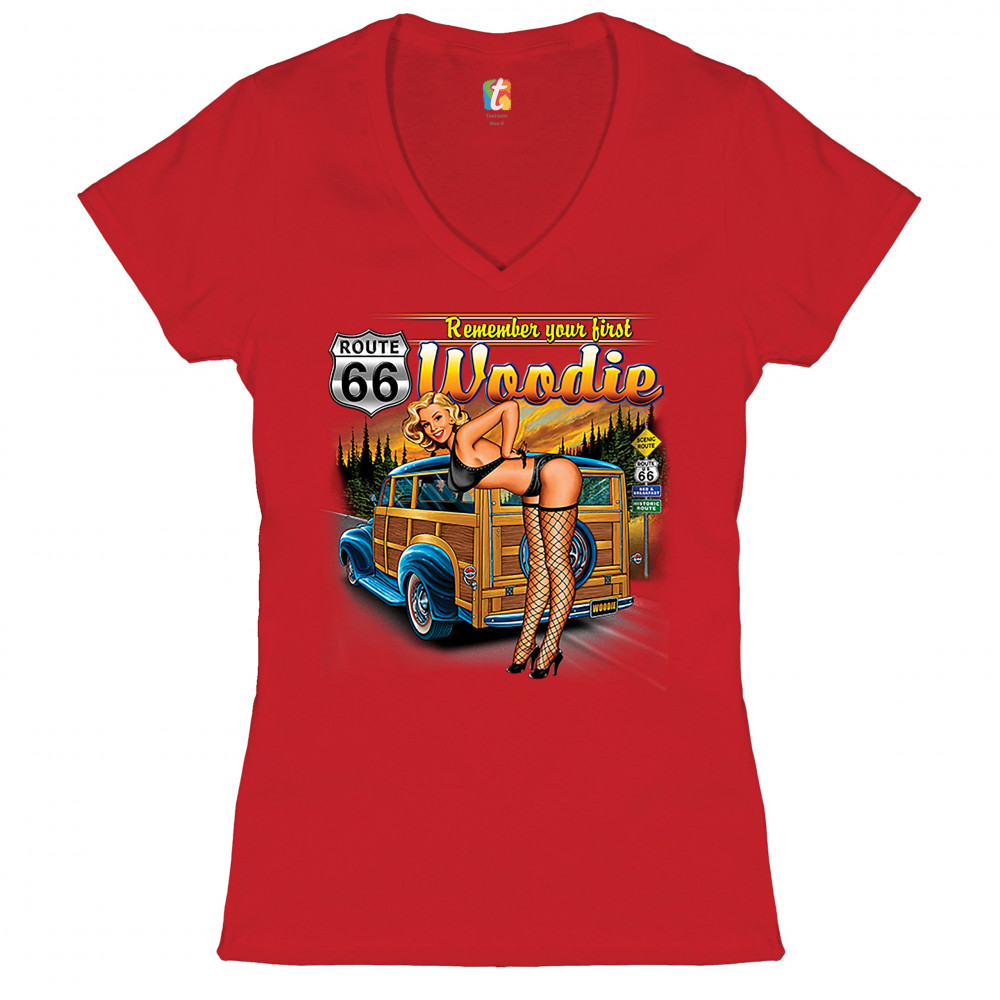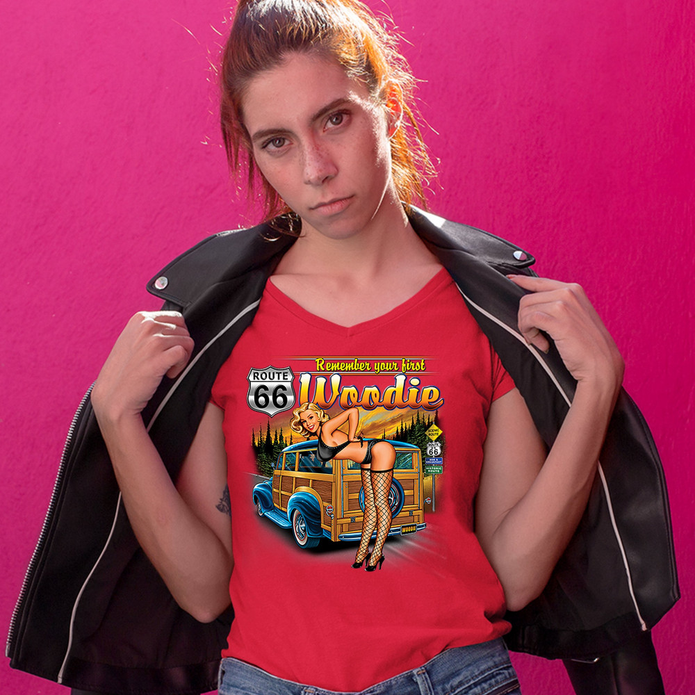 A print featuring a sexy blonde pin-up girl bending over and taking off her bra. Behind her there is a woodie wagon driving on a road. The print says: "Remeber your first woodie" and features a Route 66. A great choice for a fan of the legendary Mother Ro