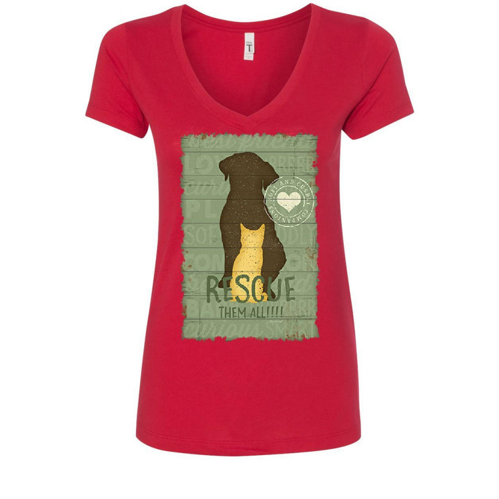 RESCUE THEM ALL women's v-neck t-shirt animal shelter dog cat paw kitten puppy red