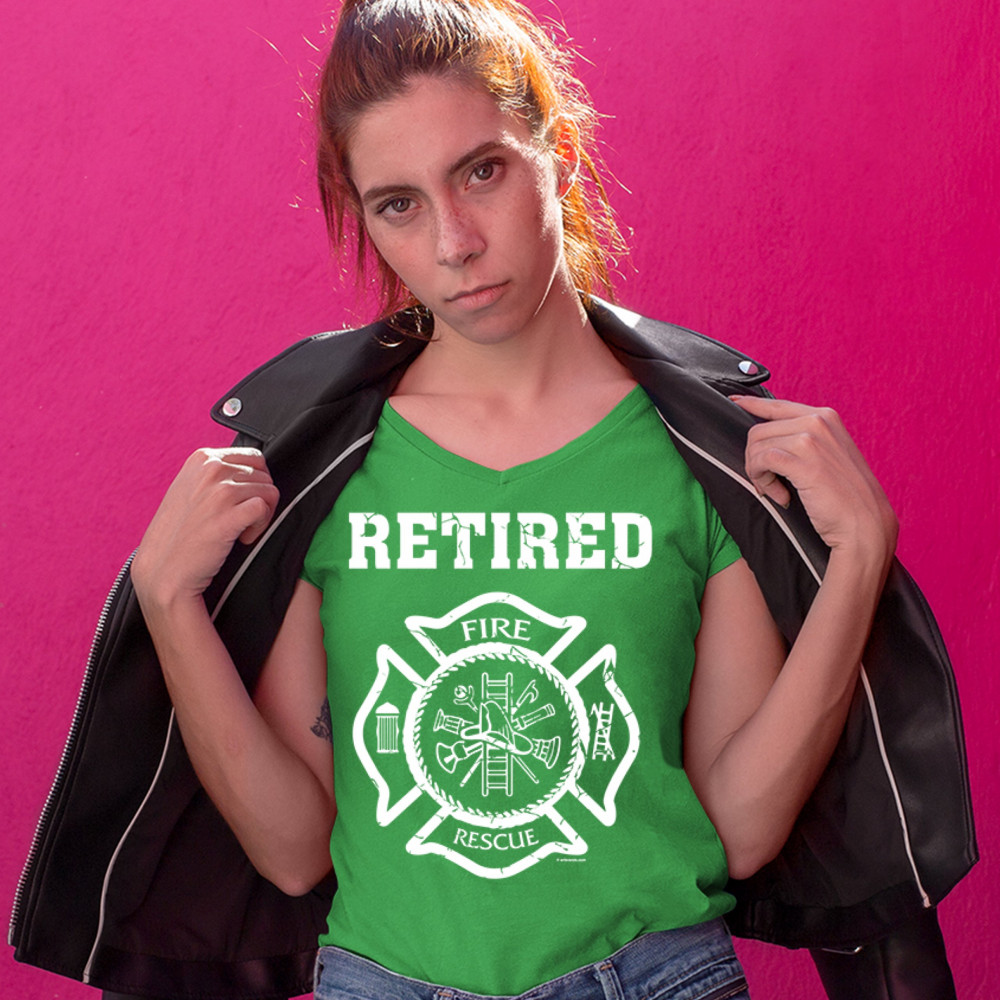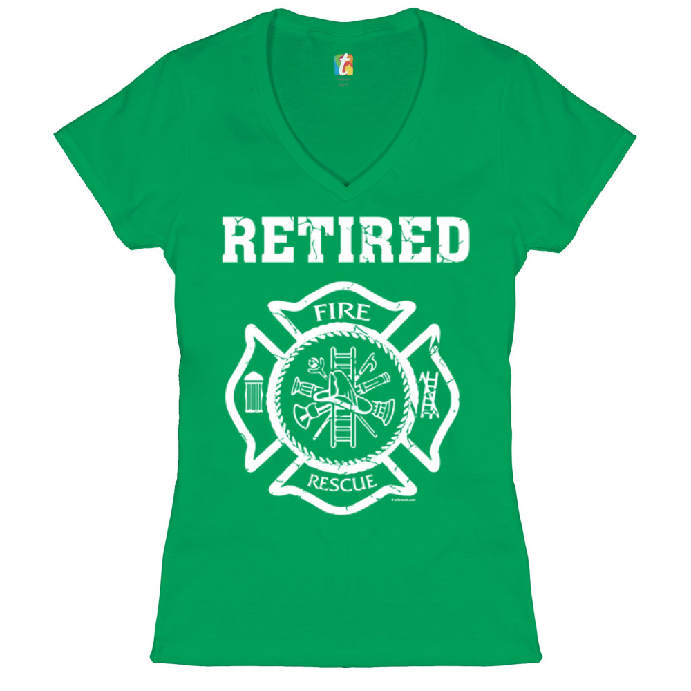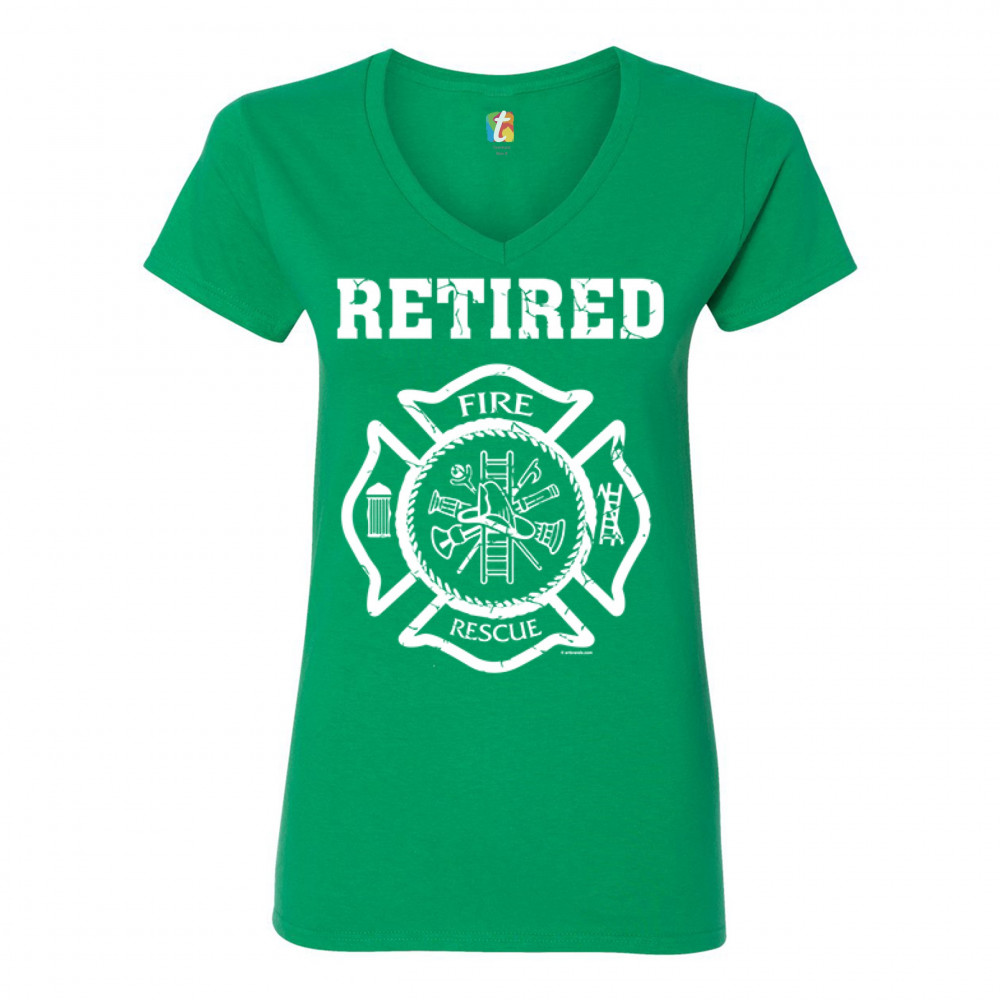 RETIRED FIREFIGHTER BADGE women's v-neck t-shirt fire and rescue fire dept tee green