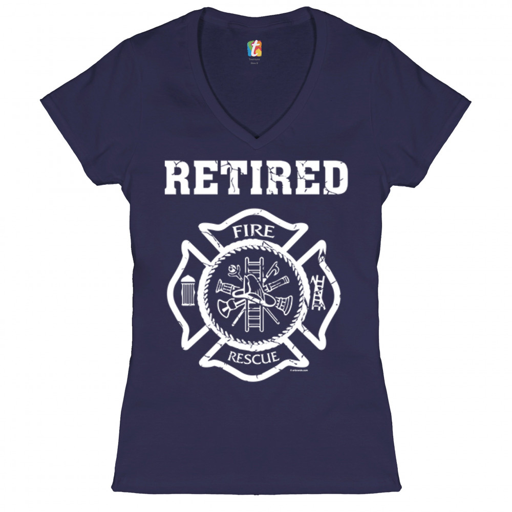 RETIRED FIREFIGHTER BADGE women's v-neck t-shirt fire and rescue fire dept tee navy blue