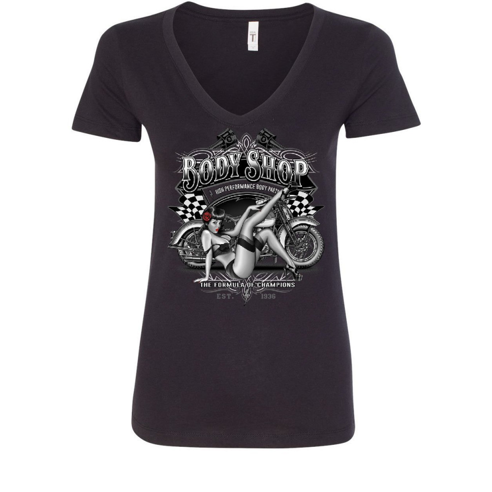 RETRO BODY SHOP women's v-neck t-shirt chopper sexy pin-up girl route 66 biker black