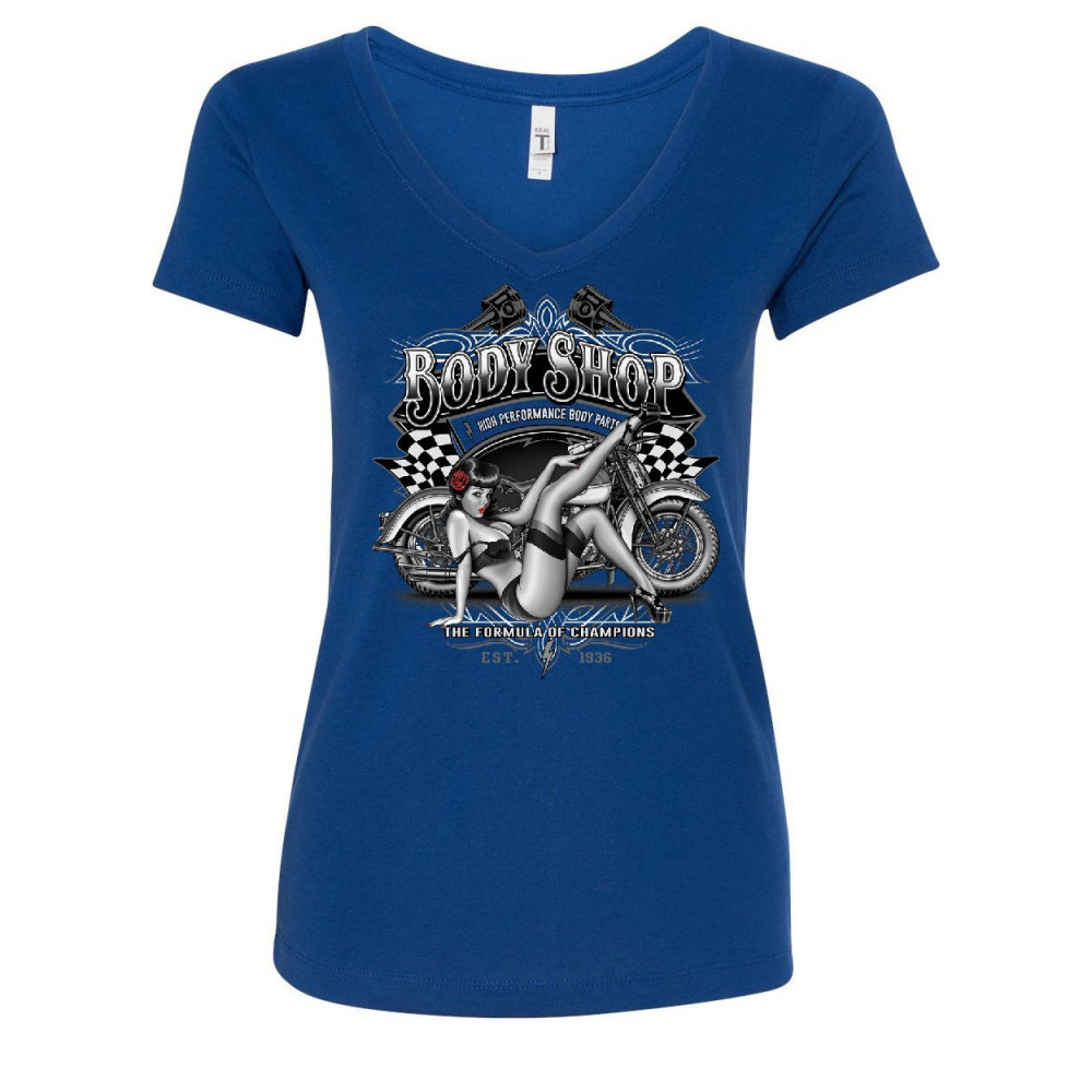 RETRO BODY SHOP women's v-neck t-shirt chopper sexy pin-up girl route 66 biker royal blue
