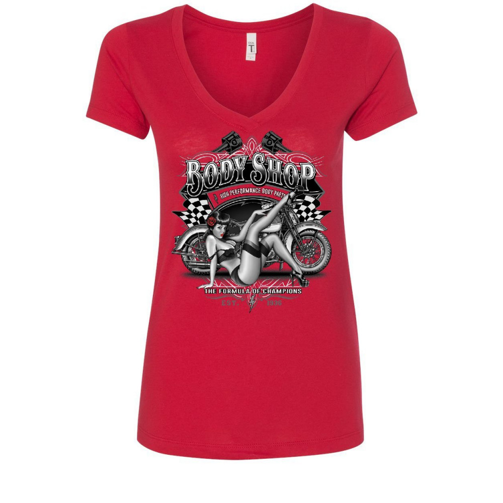RETRO BODY SHOP women's v-neck t-shirt chopper sexy pin-up girl route 66 biker red