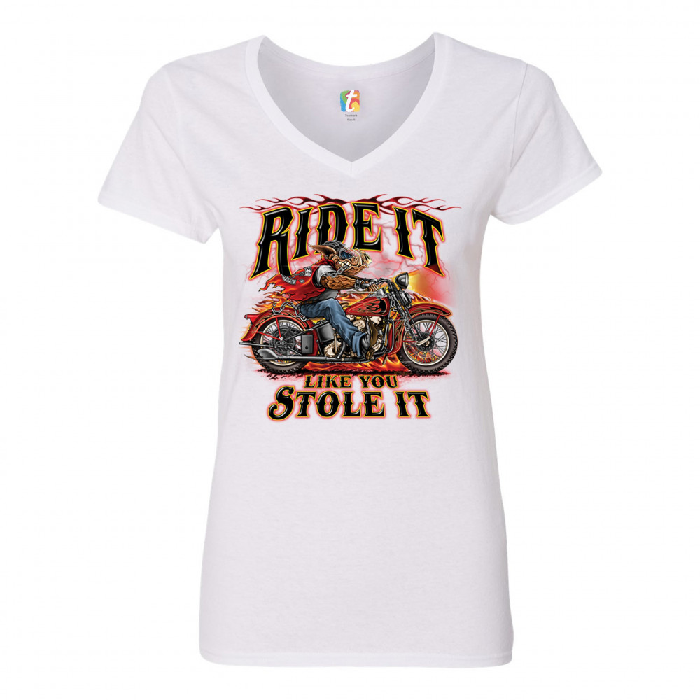 RIDE IT LIKE YOU STOLE IT women's v-neck t-shirt biker born to be wild tee white