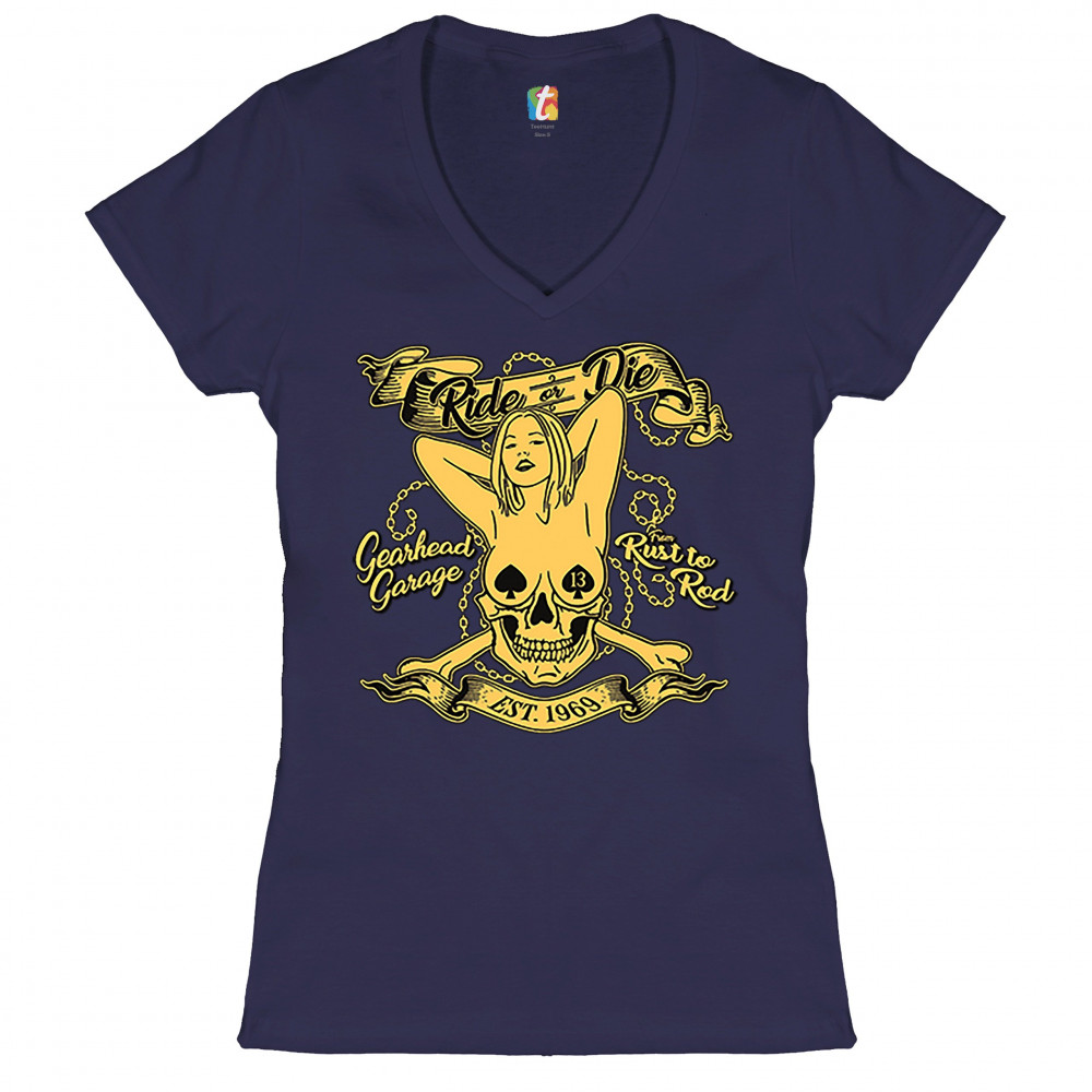 RIDE OR DIE women's v-neck t-shirt gearhead garage from rust to rod biker tee navy blue