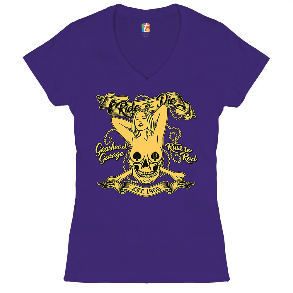 A print featuring a naked woman with her hands behind her head and spades as nipple covers. Her body is mixed with a skull. There are crossed bones and multiple chains in the background. The print says: "Ride or Die, Gearhead Garage, Rust to Rod, Est. 196