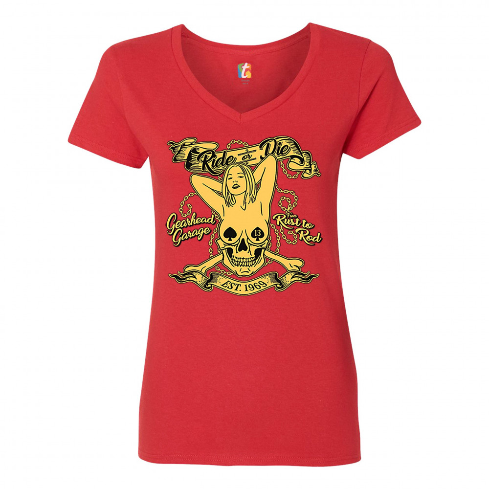 A print featuring a naked woman with her hands behind her head and spades as nipple covers. Her body is mixed with a skull. There are crossed bones and multiple chains in the background. The print says: "Ride or Die, Gearhead Garage, Rust to Rod, Est. 196