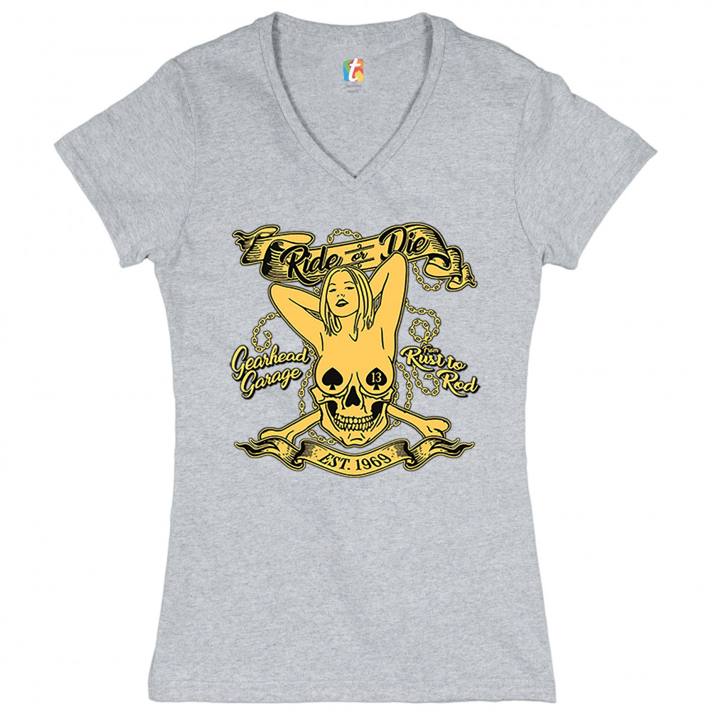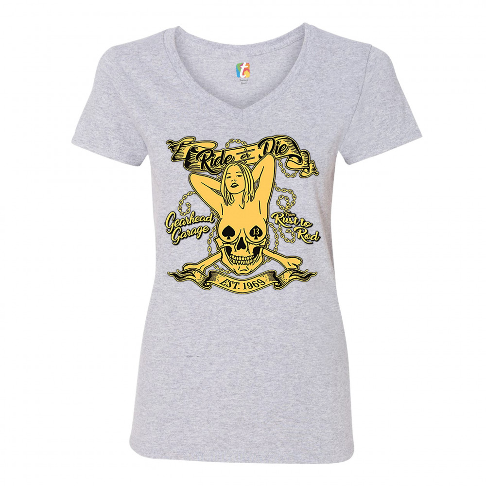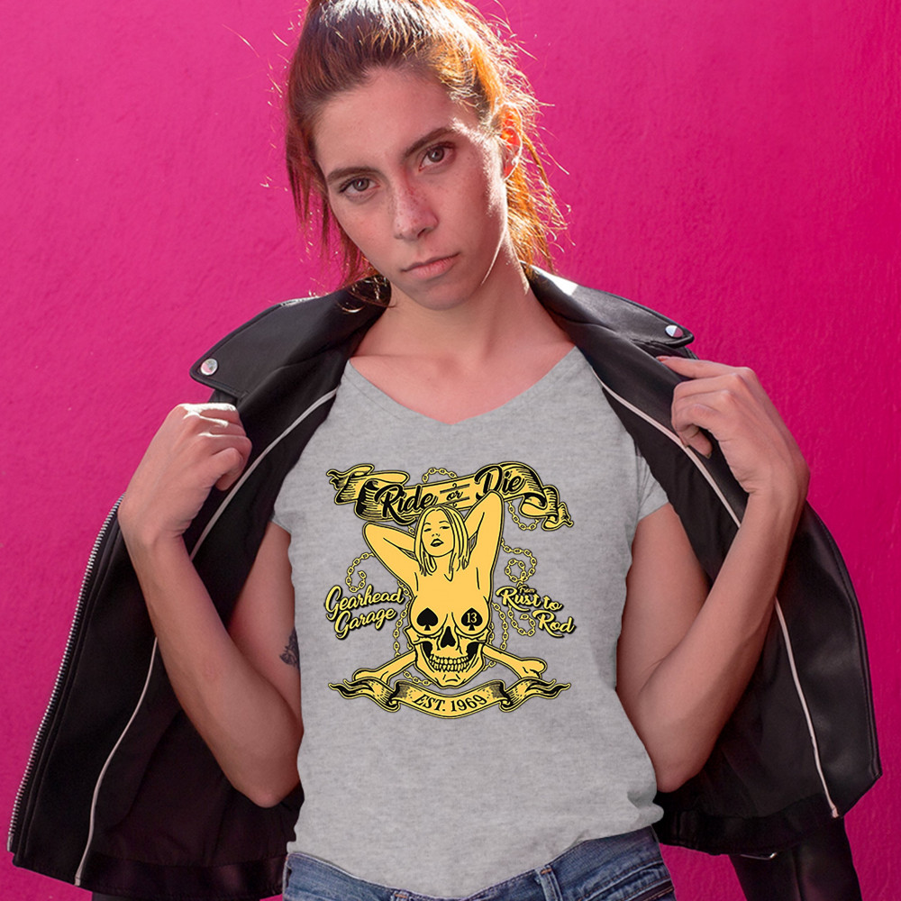 A print featuring a naked woman with her hands behind her head and spades as nipple covers. Her body is mixed with a skull. There are crossed bones and multiple chains in the background. The print says: "Ride or Die, Gearhead Garage, Rust to Rod, Est. 196