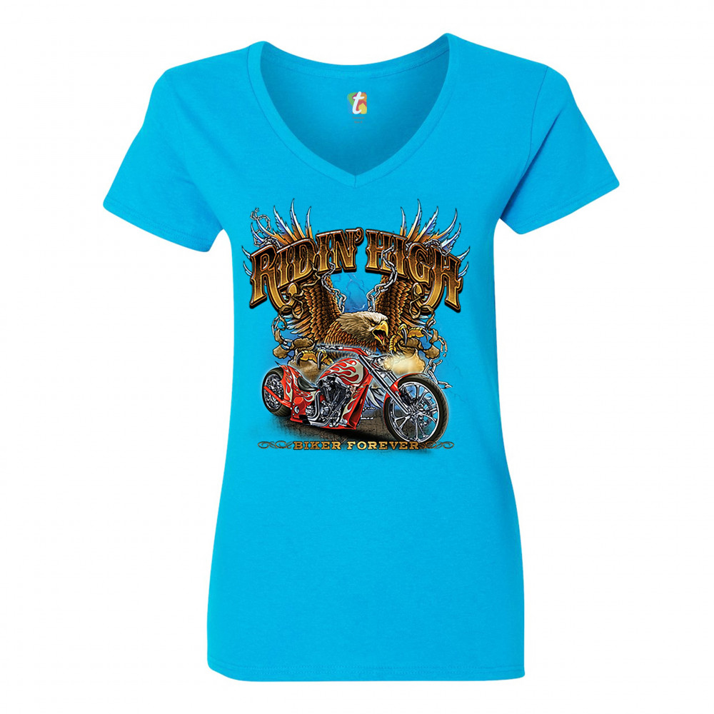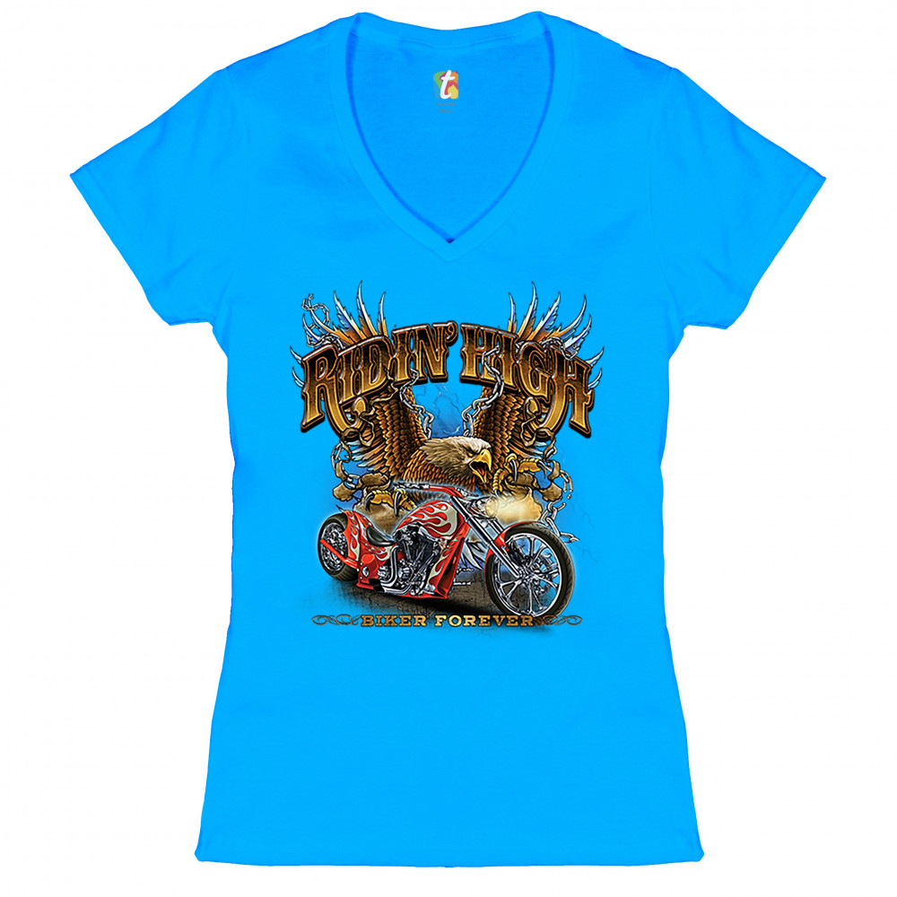 RIDIN' HIGH women's v-neck t-shirt biker forever chopper american eagle tee turquoise