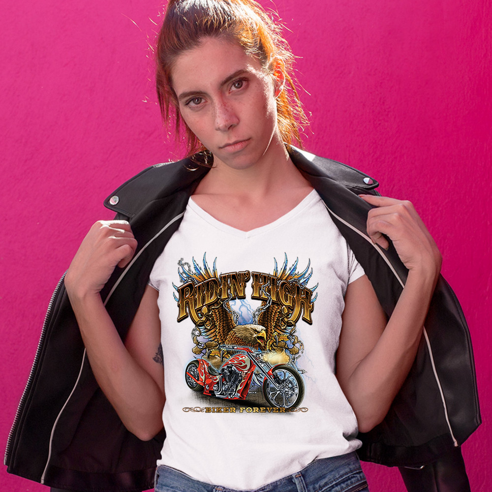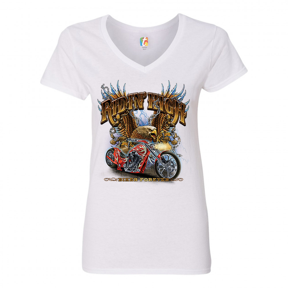 RIDIN' HIGH women's v-neck t-shirt biker forever chopper american eagle tee white